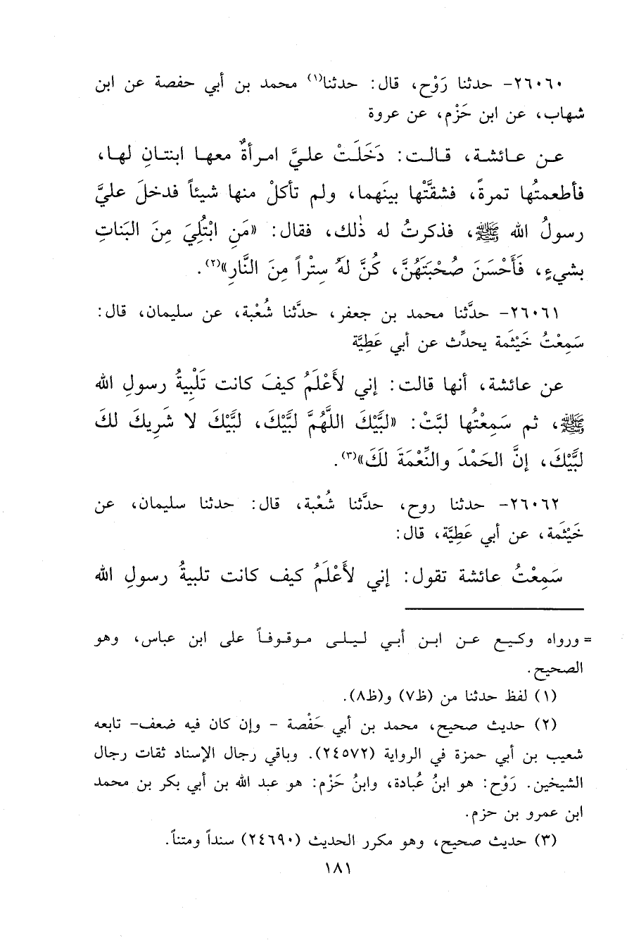 ٢٦٠٦٢ - حَدَّثَنَا رَوْحٌ، حَدَّثَنَا شُعْبَةُ، قَالَ: حَدَّثَنَا سُلَيْمَانُ، عَنْ خَيْثَمَةَ، عَنْ أَبِي عَطِيَّةَ، قَالَ: سَمِعْتُ عَائِشَةَ، تَقُولُ: إِنِّي لَأَعْلَمُ كَيْفَ كَانَتْ تَلْبِيَةُ رَسُولِ اللهِ صَلَّى اللهُ عَلَيْهِ وَسَلَّمَ،