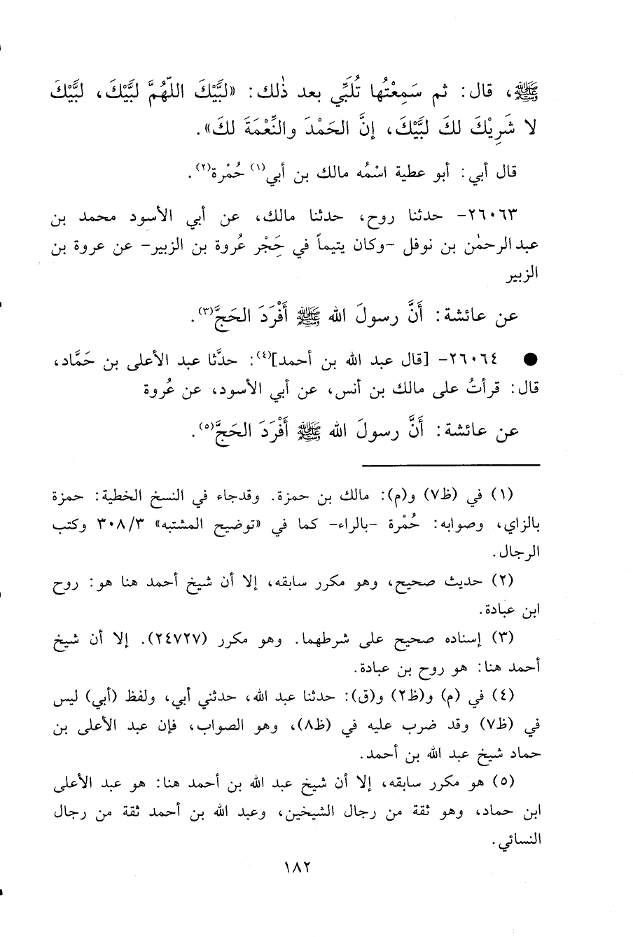 • ٢٦٠٦٤ - قَالَ عَبْدُ اللهِ بْنُ أَحْمَدَ: (٤) حَدَّثَنَا عَبْدُ الْأَعْلَى بْنُ حَمَّادٍ، قَالَ: قَرَأْتُ عَلَى مَالِكِ بْنِ أَنَسٍ، عَنْ أَبِي الْأَسْوَدِ، عَنْ عُرْوَةَ، عَنْ عَائِشَةَ، " أَنَّ رَسُولَ اللهِ صَلَّى اللهُ عَلَيْهِ وَسَلَّمَ أَفْرَدَ الْحَجَّ " (٥)