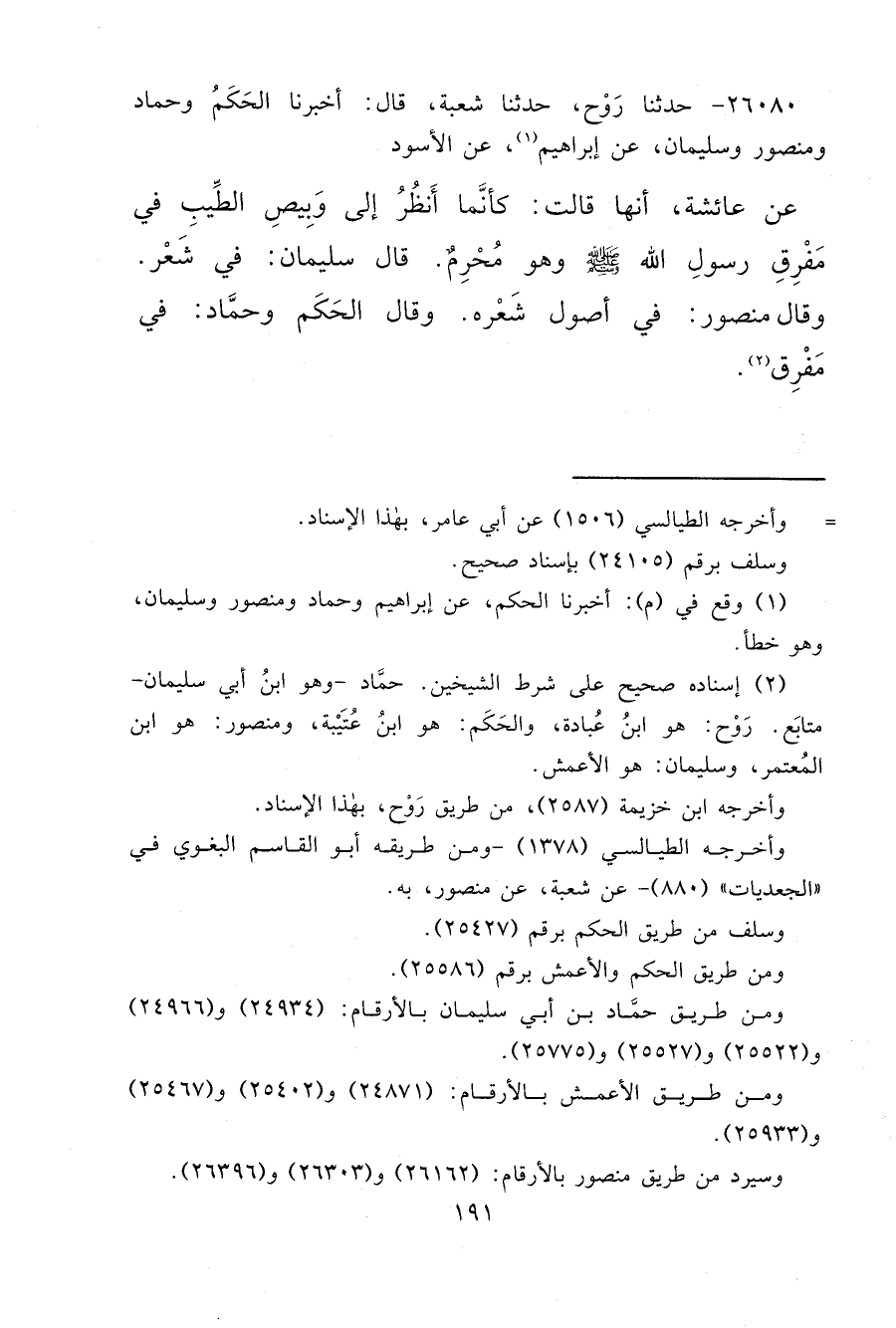 ٢٦٠٨٠ - حَدَّثَنَا رَوْحٌ، حَدَّثَنَا شُعْبَةُ، قَالَ: أَخْبَرَنَا الْحَكَمُ، وَحَمَّادٍ، وَمَنْصُورٍ، وَسُلَيْمَانَ، عَنِ إِبْرَاهِيمَ، (١) عَنْ الْأَسْوَدِ، عَنْ عَائِشَةَ، أَنَّهَا قَالَتْ: " كَأَنَّمَا أَنْظُرُ إِلَى وَبِيصِ الطِّيبِ فِي مَفْرِقِ رَسُولِ اللهِ صَلَّى اللهُ عَلَيْهِ وَسَلَّمَ وَهُوَ مُحْرِمٌ " قَالَ سُلَيْمَانُ: فِي شَعْرِ، وَقَالَ مَنْصُورٌ: فِي أُصُولِ شَعْرِهِ، وَقَالَ الْحَكَمُ، وَحَمَّادٌ: فِي مَفْرِقِ (٢)