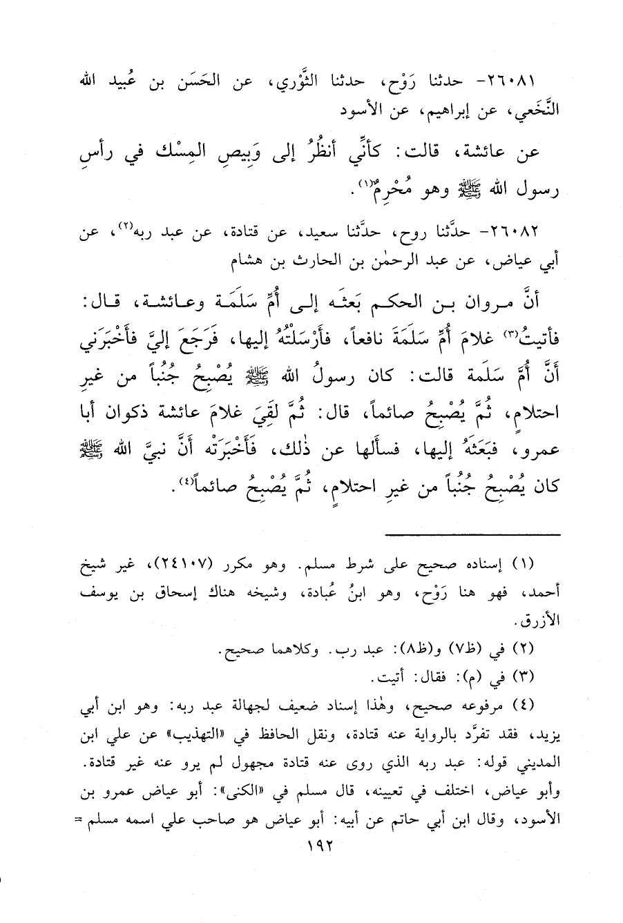 ٢٦٠٨١ - حَدَّثَنَا رَوْحٌ، حَدَّثَنَا الثَّوْرِيُّ، عَنِ الْحَسَنِ بْنِ عُبَيْدِ اللهِ النَّخَعِيِّ، عَنْ إِبْرَاهِيمَ، عَنِ الْأَسْوَدِ، عَنْ عَائِشَةَ، قَالَتْ: " كَأَنِّي أَنْظُرُ إِلَى وَبِيصِ الْمِسْكِ فِي رَأْسِ رَسُولِ اللهِ صَلَّى اللهُ عَلَيْهِ وَسَلَّمَ وَهُوَ مُحْرِمٌ " (١)