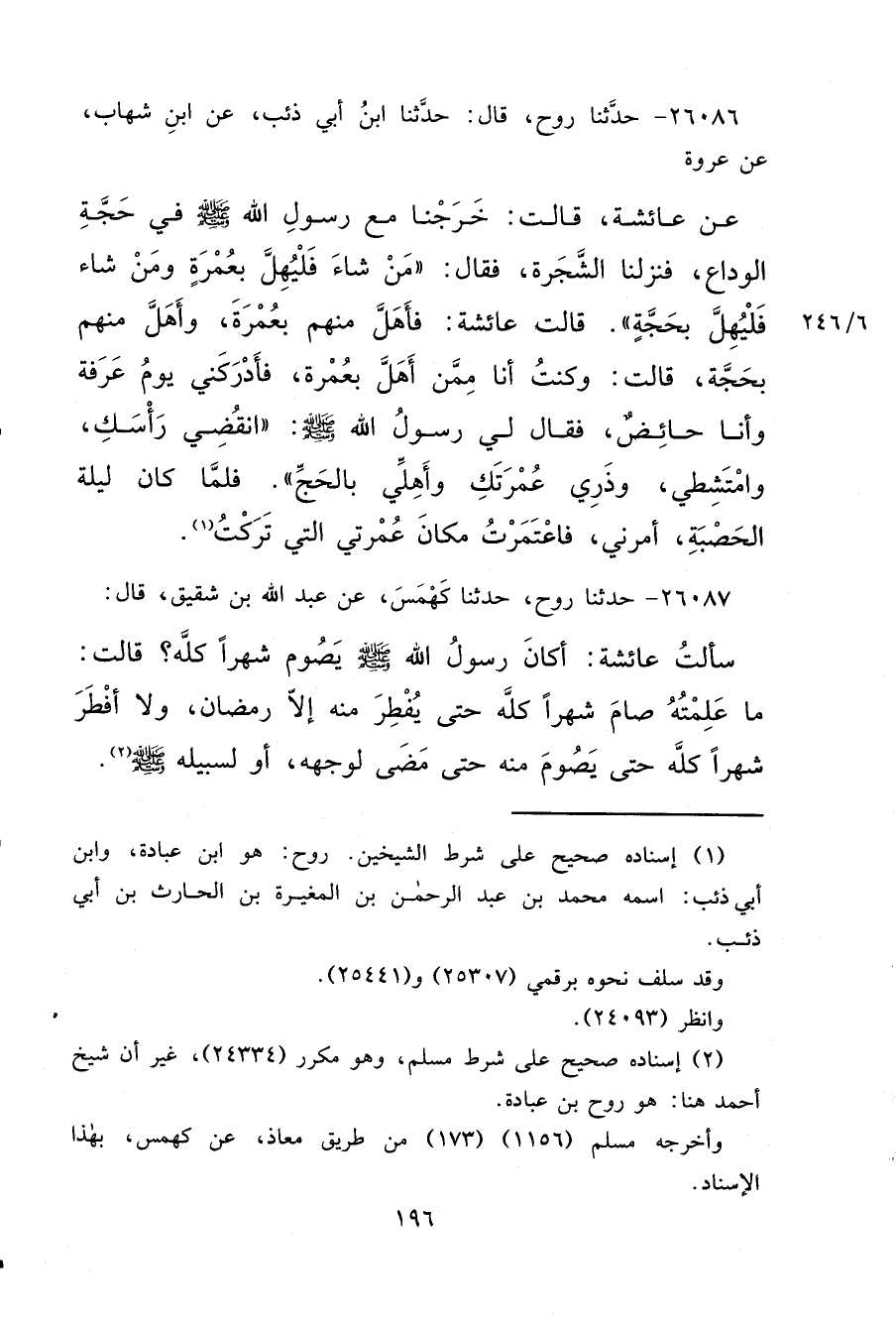 ٢٦٠٨٦ - حَدَّثَنَا رَوْحٌ، قَالَ: حَدَّثَنَا ابْنُ أَبِي ذِئْبٍ، عَنِ ابْنِ شِهَابٍ، عَنْ عُرْوَةَ، عَنْ عَائِشَةَ، قَالَتْ: خَرَجْنَا مَعَ رَسُولِ اللهِ صَلَّى اللهُ عَلَيْهِ وَسَلَّمَ فِي حَجَّةِ الْوَدَاعِ، فَنَزَلْنَا الشَّجَرَةَ، فَقَالَ: " مَنْ شَاءَ فَلْيُهِلَّ بِعُمْرَةٍ وَمَنْ شَاءَ فَلْيُهِلَّ بِحَجَّةٍ " قَالَتْ عَائِشَةُ: فَأَهَلَّ مِنْهُمْ بِعُمْرَةٍ، وَأَهَلَّ مِنْهُمْ بِحَجَّةٍ، قَالَتْ: وَكُنْتُ أَنَا مِمَّنْ أَهَلَّ بِعُمْرَةٍ، فَأَدْرَكَنِي يَوْمُ عَرَفَةَ وَأَنَا حَائِضٌ، فَقَالَ لِي رَسُولُ اللهِ صَلَّى اللهُ عَلَيْهِ وَسَلَّمَ: " انْقُضِي رَأْسَكِ، وَامْتَشِطِي، وَذَرِي عُمْرَتَكِ وَأَهِلِّي بِالْحَجِّ ". فَلَمَّا كَانَ لَيْلَةُ الْحَصْبَةِ، أَمَرَنِي فَاعْتَمَرْتُ مَكَانَ عُمْرَتِي الَّتِي تَرَكْتُ (١)