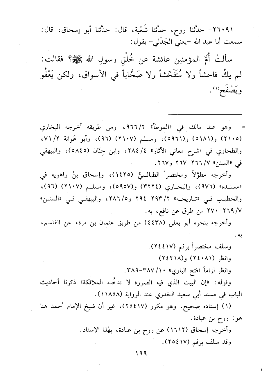 ٢٦٠٩١ - حَدَّثَنَا رَوْحٌ، حَدَّثَنَا شُعْبَةُ، قَالَ: حَدَّثَنَا أَبُو إِسْحَاقَ، قَالَ: سَمِعْتُ أَبَا عَبْدِ اللهِ يَعْنِي الْجَدَلِيَّ، يَقُولُ: سَأَلْتُ أُمَّ الْمُؤْمِنِينَ عَائِشَةَ عَنْ خُلُقِ رَسُولِ اللهِ صَلَّى اللهُ عَلَيْهِ وَسَلَّمَ، فَقَالَتْ: " لَمْ يَكُ فَاحِشًا، وَلَا مُتَفَحِّشًا، وَلَا صَخَّابًا فِي الْأَسْوَاقِ، وَلَكِنْ يَعْفُو وَيَصْفَحُ " (١)