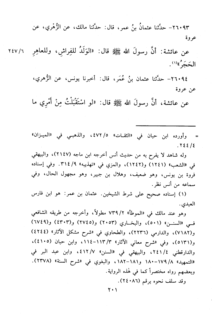 ٢٦٠٩٣ - حَدَّثَنَا عُثْمَانُ بْنُ عُمَرَ، قَالَ: حَدَّثَنَا مَالِكٌ، عَنِ الزُّهْرِيِّ، عَنْ عُرْوَةَ، عَنْ عَائِشَةَ، أَنَّ رَسُولَ اللهِ صَلَّى اللهُ عَلَيْهِ وَسَلَّمَ قَالَ: " الْوَلَدُ لِلْفِرَاشِ، وَلِلْعَاهِرِ الْحَجَرُ " (١)