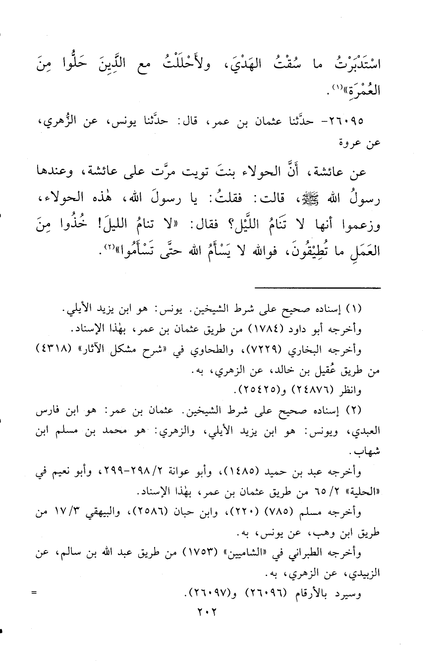 ٢٦٠٩٥ - حَدَّثَنَا عُثْمَانُ بْنُ عُمَرَ، قَالَ: حَدَّثَنَا يُونُسُ، عَنِ الزُّهْرِيِّ، عَنْ عُرْوَةَ، عَنْ عَائِشَةَ، أَنَّ الْحَوْلَاءَ بِنْتَ تُوَيْتٍ، مَرَّتْ عَلَى عَائِشَةَ وَعِنْدَهَا رَسُولُ اللهِ صَلَّى اللهُ عَلَيْهِ وَسَلَّمَ، قَالَتْ: فَقُلْتُ: يَا رَسُولَ اللهِ، هَذِهِ الْحَوْلَاءُ، وَزَعَمُوا أَنَّهَا لَا تَنَامُ اللَّيْلَ؟ فَقَالَ: " لَا تَنَامُ اللَّيْلَ خُذُوا مِنَ الْعَمَلِ مَا تُطِيقُونَ، فَوَاللهِ لَا يَسْأَمُ اللهُ حَتَّى تَسْأَمُوا " (٢)