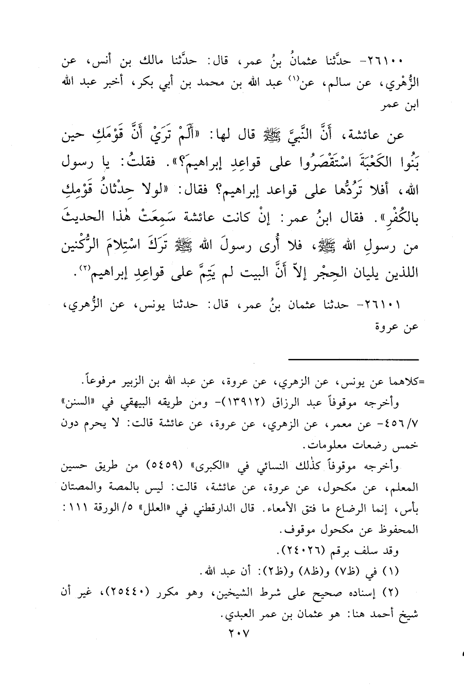 ٢٦١٠٠ - حَدَّثَنَا عُثْمَانُ بْنُ عُمَرَ، قَالَ: حَدَّثَنَا مَالِكُ بْنُ أَنَسٍ، عَنِ الزُّهْرِيِّ، عَنْ سَالِمٍ، عَنْ (١) عَبْدِ اللهِ بْنِ مُحَمَّدِ بْنِ أَبِي بَكْرٍ، أَخْبَرَ عَبْدَ اللهِ بْنَ عُمَرَ، عَنْ عَائِشَةَ، أَنَّ النَّبِيَّ صَلَّى اللهُ عَلَيْهِ وَسَلَّمَ قَالَ لَهَا: " أَلَمْ تَرَيْ أَنَّ قَوْمَكِ حِينَ بَنَوْا الْكَعْبَةَ اسْتَقْصَرُوا عَلَى قَوَاعِدِ إِبْرَاهِيمَ؟ " فَقُلْتُ: يَا رَسُولَ اللهِ، أَفَلَا تَرُدُّهَا عَلَى قَوَاعِدِ إِبْرَاهِيمَ؟ فَقَالَ: " لَوْلَا حِدْثَانُ قَوْمِكِ بِالْكُفْرِ ". فَقَالَ ابْنُ عُمَرَ: إِنْ كَانَتْ عَائِشَةُ سَمِعَتْ هَذَا الْحَدِيثَ مِنْ رَسُولِ اللهِ صَلَّى اللهُ عَلَيْهِ وَسَلَّمَ، فَلَا أَرَى رَسُولَ اللهِ صَلَّى اللهُ عَلَيْهِ وَسَلَّمَ تَرَكَ اسْتِلَامَ الرُّكْنَيْنِ اللَّذَيْنِ يَلِيَانِ الْحَجَرَ إِلَّا أَنَّ الْبَيْتَ لَمْ يُتَمَّ عَلَى قَوَاعِدِ إِبْرَاهِيمَ (٢)