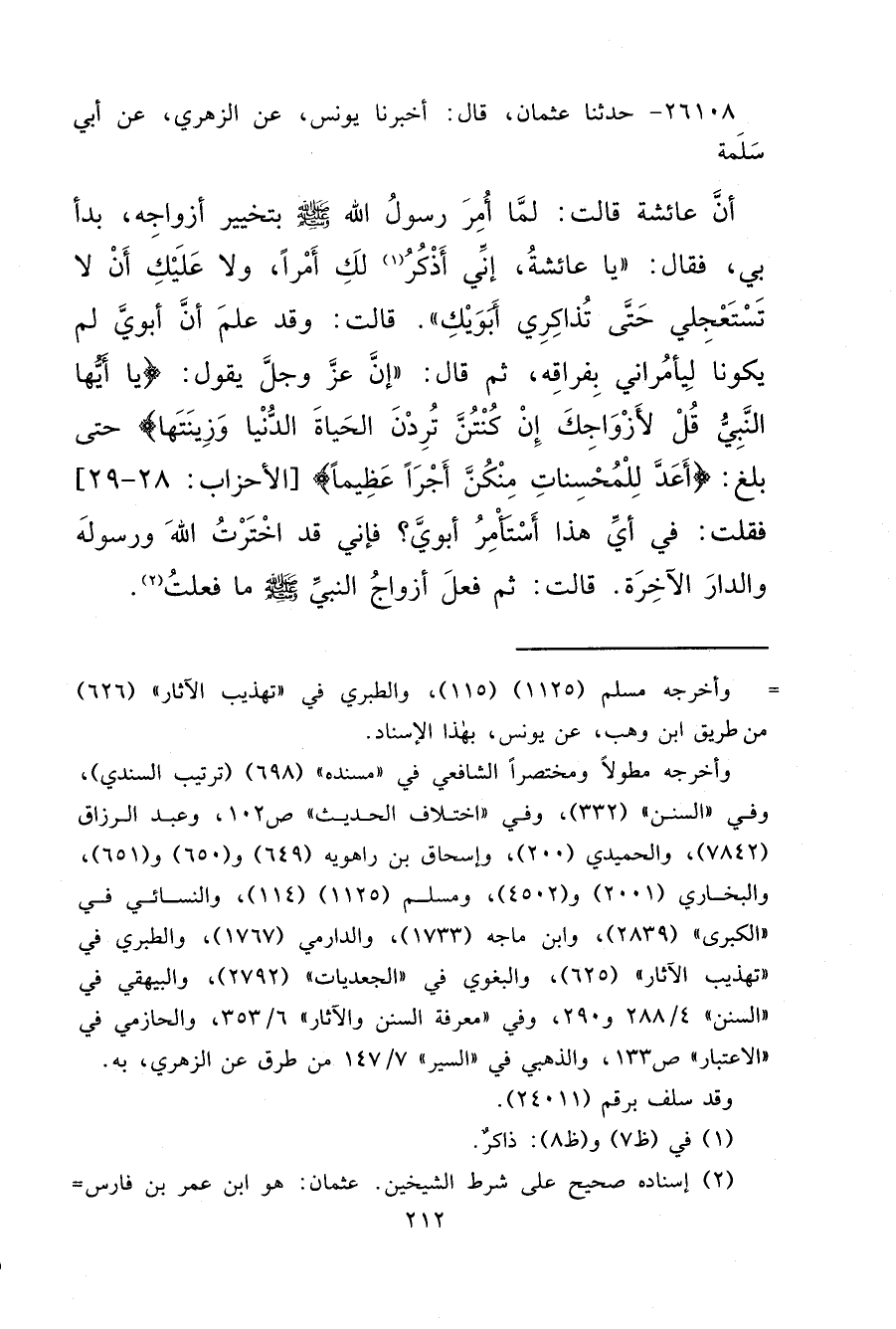 ٢٦١٠٨ - حَدَّثَنَا عُثْمَانُ، قَالَ: أَخْبَرَنَا يُونُسُ، عَنِ الزُّهْرِيِّ، عَنْ أَبِي سَلَمَةَ، أَنَّ عَائِشَةَ، قَالَتْ: لَمَّا أُمِرَ رَسُولُ اللهِ صَلَّى اللهُ عَلَيْهِ وَسَلَّمَ بِتَخْيِيرِ أَزْوَاجِهِ، بَدَأَ بِي، فَقَالَ: " يَا عَائِشَةُ إِنِّي أَذْكُرُ (١) لَكِ أَمْرًا، وَلَا عَلَيْكِ أَنْ لَا تَسْتَعْجِلِي حَتَّى تُذَاكِرِي أَبَوَيْكِ " قَالَتْ: وَقَدْ عَلِمَ أَنَّ أَبَوَيَّ لَمْ يَكُونَا لِيَأْمُرَانِي بِفِرَاقِهِ، ثُمَّ قَالَ: إِنَّ اللهَ عَزَّ وَجَلَّ يَقُولُ: {يَا أَيُّهَا النَّبِيُّ قُلْ لِأَزْوَاجِكَ إِنْ كُنْتُنَّ تُرِدْنَ الْحَيَاةَ الدُّنْيَا وَزِينَتَهَا} [الأحزاب: ٢٨] حَتَّى بَلَغَ: {أَعَدَّ لِلْمُحْسِنَاتِ مِنْكُنَّ أَجْرًا عَظِيمًا} [الأحزاب: ٢٩] فَقُلْتُ: فِي أَيِّ هَذَا أَسْتَأْمِرُ أَبَوَيَّ؟ فَإِنِّي قَدْ اخْتَرْتُ اللهَ وَرَسُولَهُ وَالدَّارَ الْآخِرَةَ. قَالَتْ: ثُمَّ فَعَلَ أَزْوَاجُ النَّبِيِّ صَلَّى اللهُ عَلَيْهِ وَسَلَّمَ مَا فَعَلْتُ (٢)