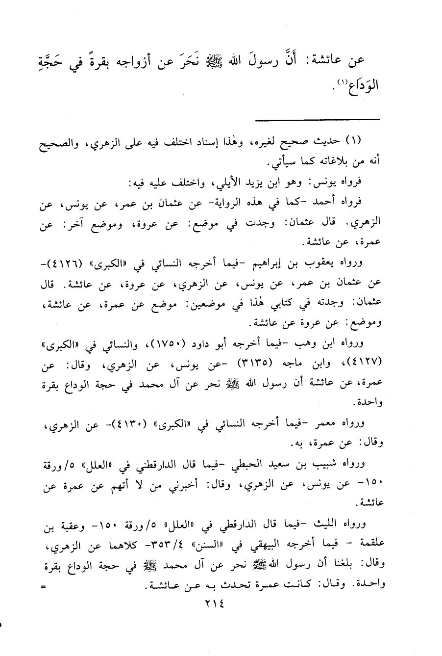 عَنْ عَائِشَةَ، " أَنَّ رَسُولَ اللهِ صَلَّى اللهُ عَلَيْهِ وَسَلَّمَ نَحَرَ عَنْ أَزْوَاجِهِ بَقَرَةً فِي حَجَّةِ الْوَدَاعِ " (١)