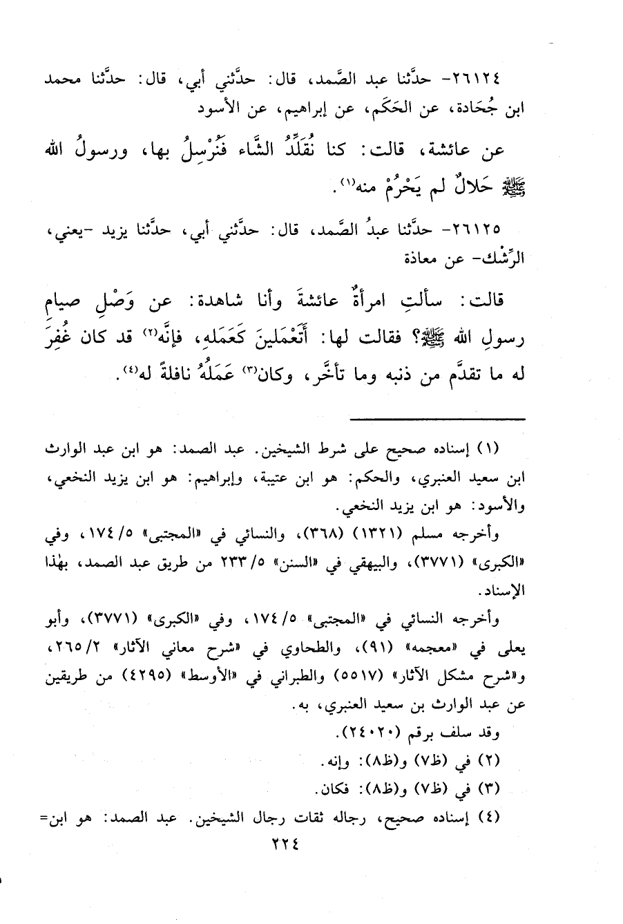 ٢٦١٢٥ - حَدَّثَنَا عَبْدُ الصَّمَدِ، قَالَ: حَدَّثَنِي أَبِي، حَدَّثَنَا يَزِيدُ يَعْنِي الرِّشْكَ، عَنْ مُعَاذَةَ، قَالَتْ: سَأَلَتْ امْرَأَةٌ عَائِشَةَ وَأَنَا شَاهِدَةٌ عَنْ وَصْلِ صِيَامِ رَسُولِ اللهِ صَلَّى اللهُ عَلَيْهِ وَسَلَّمَ فَقَالَتْ لَهَا: " أَتَعْمَلِينَ كَعَمَلِهِ، فَإِنَّهُ (٢) قَدْ كَانَ غُفِرَ لَهُ مَا تَقَدَّمَ مِنْ ذَنْبِهِ وَمَا تَأَخَّرَ، وَكَانَ (٣) عَمَلُهُ نَافِلَةً لَهُ " (٤)