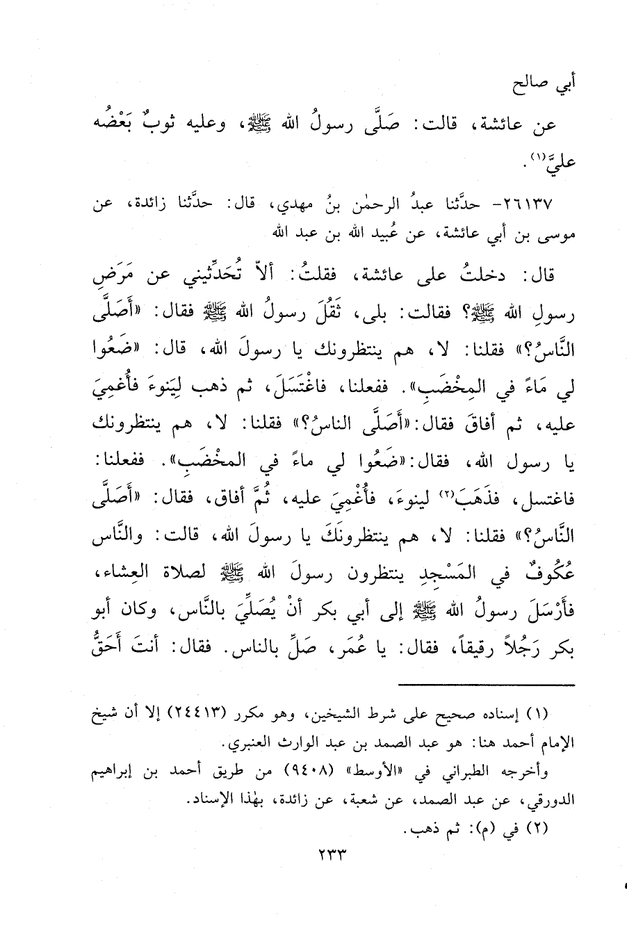٢٦١٣٧ - حَدَّثَنَا عَبْدُ الرَّحْمَنِ بْنُ مَهْدِيٍّ، قَالَ: حَدَّثَنَا زَائِدَةُ، عَنْ مُوسَى بْنِ أَبِي عَائِشَةَ، عَنْ عُبَيْدِ اللهِ بْنِ عَبْدِ اللهِ، قَالَ: دَخَلْتُ عَلَى عَائِشَةَ فَقُلْتُ: أَلَا تُحَدِّثِينِي عَنْ مَرَضِ رَسُولِ اللهِ صَلَّى اللهُ عَلَيْهِ وَسَلَّمَ؟ فَقَالَتْ: بَلَى، ثَقُلَ رَسُولُ اللهِ صَلَّى اللهُ عَلَيْهِ وَسَلَّمَ فَقَالَ: " أَصَلَّى النَّاسُ؟ " فَقُلْنَا: لَا، هُمْ يَنْتَظِرُونَكَ يَا رَسُولَ اللهِ، قَالَ: " ضَعُوا لِي مَاءً فِي الْمِخْضَبِ " فَفَعَلْنَا، فَاغْتَسَلَ، ثُمَّ ذَهَبَ لِيَنُوءَ فَأُغْمِيَ عَلَيْهِ، ثُمَّ أَفَاقَ فَقَالَ: " أَصَلَّى النَّاسُ؟ " فَقُلْنَا: لَا، هُمْ يَنْتَظِرُونَكَ يَا رَسُولَ اللهِ، فَقَالَ: " ضَعُوا لِي مَاءً فِي الْمِخْضَبِ ". فَفَعَلْنَا: فَاغْتَسَلَ، فَذَهَبَ (٢) لِيَنُوءَ، فَأُغْمِيَ عَلَيْهِ، ثُمَّ أَفَاقَ، فَقَالَ: " أَصَلَّى النَّاسُ؟ " فَقُلْنَا: لَا، هُمْ يَنْتَظِرُونَكَ يَا رَسُولَ اللهِ، قَالَتْ: وَالنَّاسُ عُكُوفٌ فِي الْمَسْجِدِ يَنْتَظِرُونَ رَسُولَ اللهِ صَلَّى اللهُ عَلَيْهِ وَسَلَّمَ لِصَلَاةِ الْعِشَاءِ، فَأَرْسَلَ رَسُولُ اللهِ صَلَّى اللهُ عَلَيْهِ وَسَلَّمَ إِلَى أَبِي بَكْرٍ أَنْ يُصَلِّيَ بِالنَّاسِ، وَكَانَ أَبُو بَكْرٍ رَجُلًا رَقِيقًا، فَقَالَ: يَا عُمَرُ صَلِّ بِالنَّاسِ. فَقَالَ: أَنْتَ أَحَقُّ