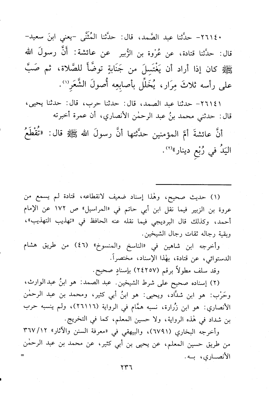 ٢٦١٤١ - حَدَّثَنَا عَبْدُ الصَّمَدِ، قَالَ: حَدَّثَنَا حَرْبٌ، قَالَ: حَدَّثَنَا يَحْيَى، قَالَ: حَدَّثَنِي مُحَمَّدُ بْنُ عَبْدِ الرَّحْمَنِ الْأَنْصَارِيُّ، أَنَّ عَمْرَةَ، أَخْبَرَتْهُ أَنَّ عَائِشَةَ أُمَّ الْمُؤْمِنِينَ حَدَّثَتْهَا أَنَّ رَسُولَ اللهِ صَلَّى اللهُ عَلَيْهِ وَسَلَّمَ، قَالَ: " تُقْطَعُ الْيَدُ فِي رُبُعِ دِينَارٍ " (٢)