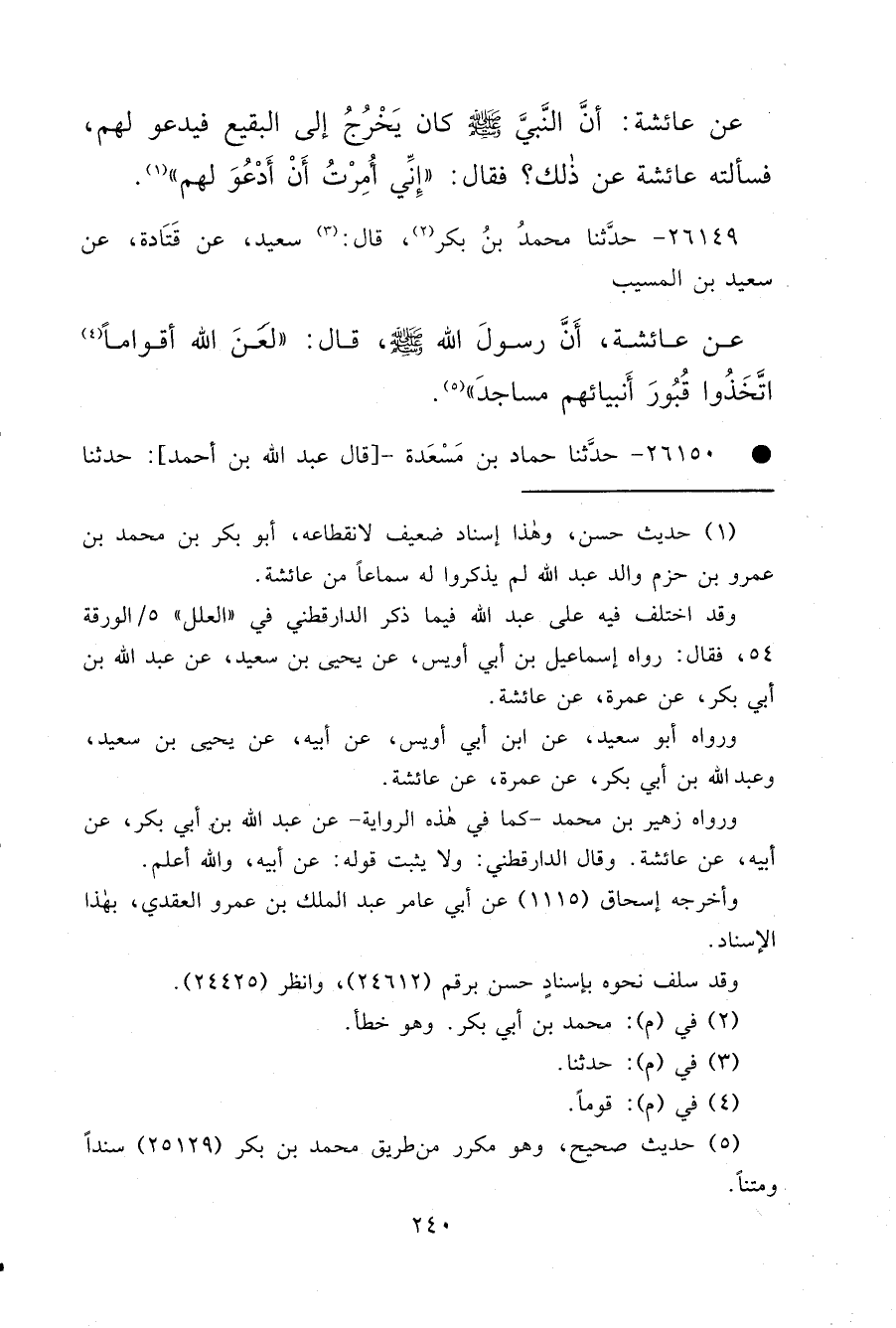 ٢٦١٤٩ - حَدَّثَنَا مُحَمَّدُ بْنُ بَكْرٍ، (٢) قَالَ (٣) : سَعِيدٌ، عَنْ قَتَادَةَ، عَنْ سَعِيدِ بْنِ الْمُسَيِّبِ، عَنْ عَائِشَةَ، أَنَّ رَسُولَ اللهِ صَلَّى اللهُ عَلَيْهِ وَسَلَّمَ قَالَ: " لَعَنَ اللهُ أَقْوَامًا (٤) اتَّخَذُوا قُبُورَ أَنْبِيَائِهِمْ مَسَاجِدَ " (٥)