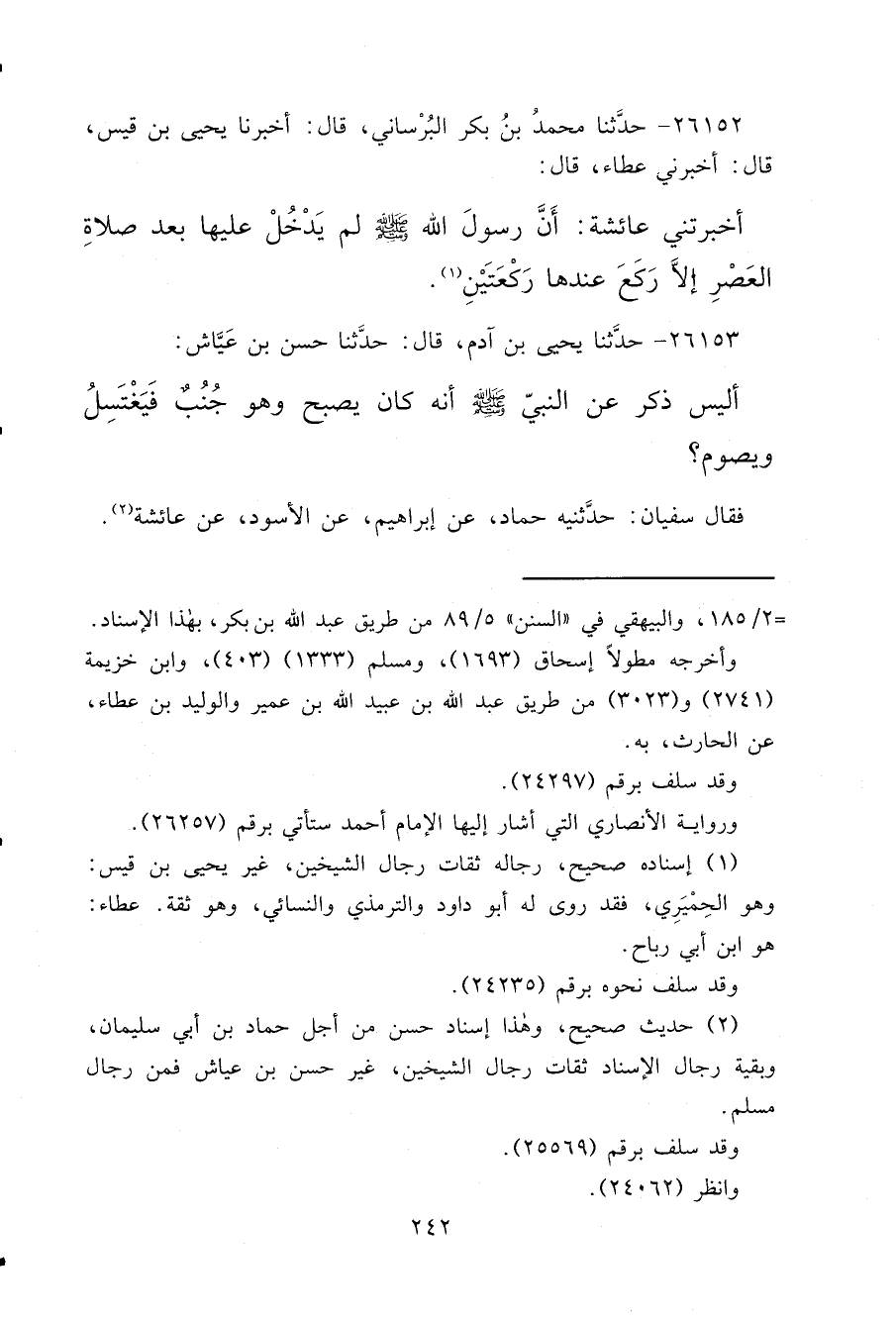 ٢٦١٥٢ - حَدَّثَنَا مُحَمَّدُ بْنُ بَكْرٍ الْبُرْسَانِيُّ، قَالَ: أَخْبَرَنَا يَحْيَى بْنُ قَيْسٍ، قَالَ: أَخْبَرَنِي عَطَاءٌ، قَالَ: أَخْبَرَتْنِي عَائِشَةُ: " أَنَّ رَسُولَ اللهِ صَلَّى اللهُ عَلَيْهِ وَسَلَّمَ لَمْ يَدْخُلْ عَلَيْهَا بَعْدَ صَلَاةِ الْعَصْرِ إِلَّا رَكَعَ عِنْدَهَا رَكْعَتَيْنِ " (١)