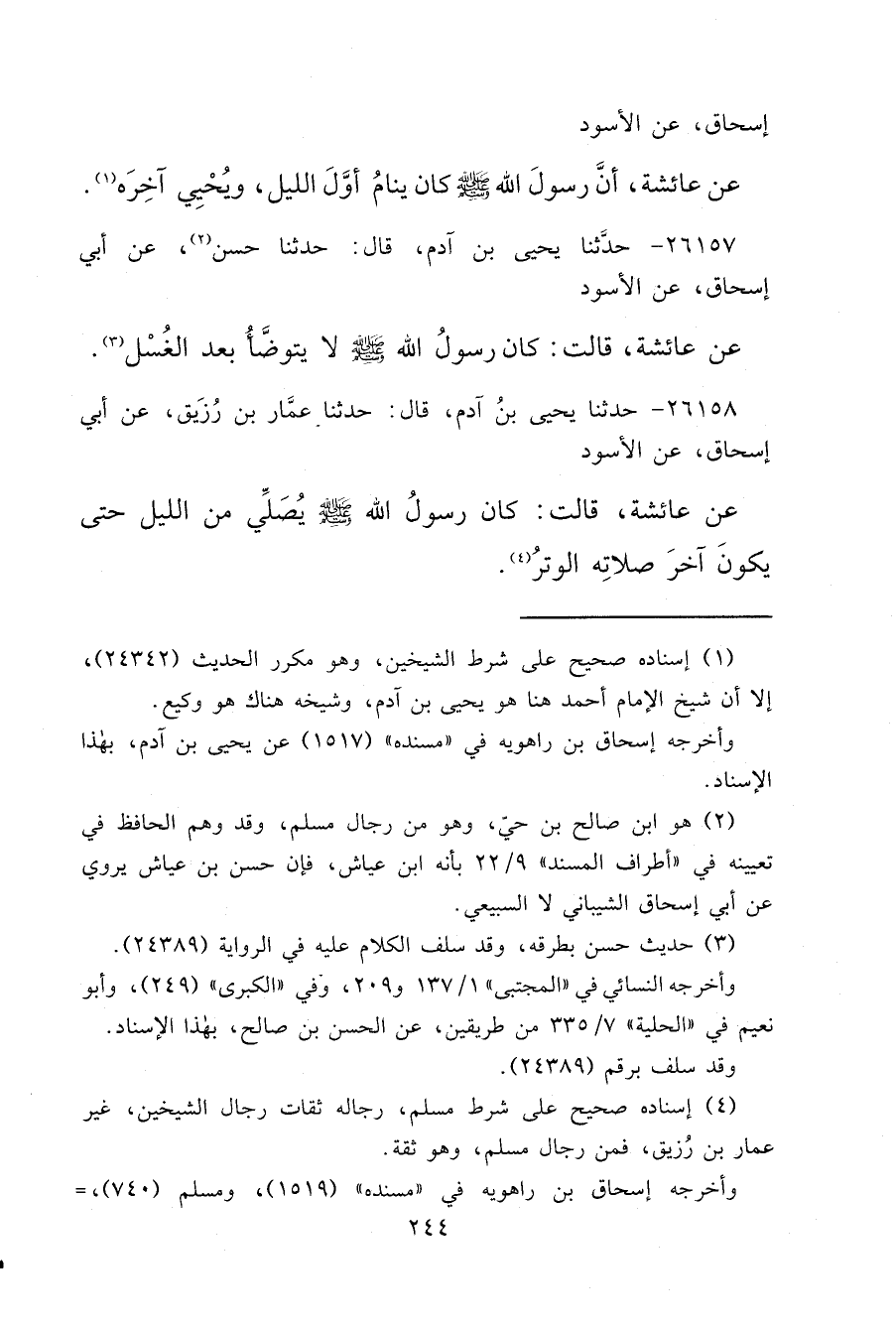 إِسْحَاقَ، عَنِ الْأَسْوَدِ، عَنْ عَائِشَةَ، " أَنَّ رَسُولَ اللهِ صَلَّى اللهُ عَلَيْهِ وَسَلَّمَ كَانَ يَنَامُ أَوَّلَ اللَّيْلِ وَيُحْيِي آخِرَهُ " (١)