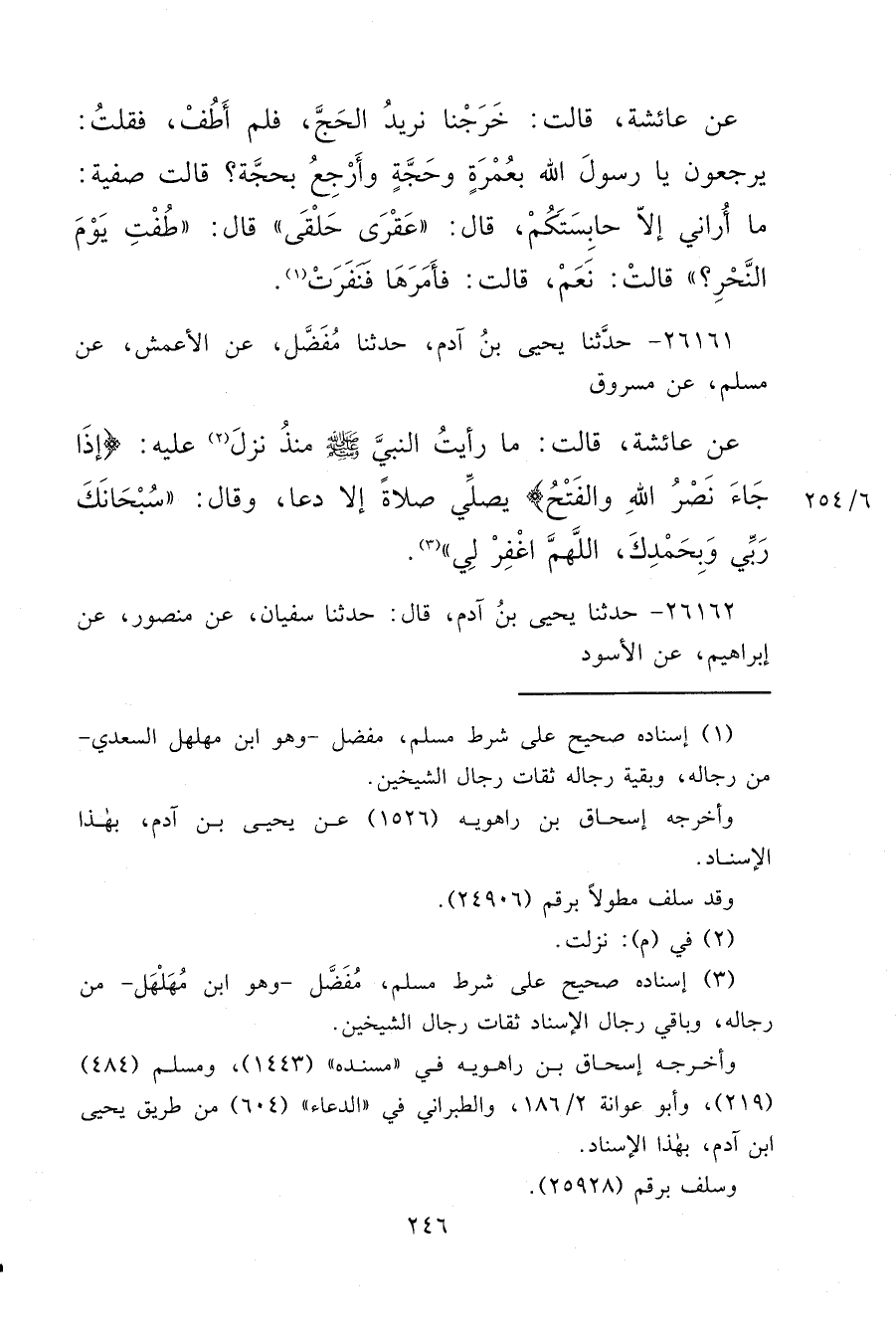 ٢٦١٦١ - حَدَّثَنَا يَحْيَى بْنُ آدَمَ، حَدَّثَنَا مُفَضَّلٌ، عَنِ الْأَعْمَشِ، عَنْ مُسْلِمٍ، عَنْ مَسْرُوقٍ، عَنْ عَائِشَةَ، قَالَتْ: مَا رَأَيْتُ النَّبِيَّ صَلَّى اللهُ عَلَيْهِ وَسَلَّمَ مُنْذُ نَزَلَ (٢) عَلَيْهِ: إِذَا جَاءَ نَصْرُ اللهِ وَالْفَتْحُ يُصَلِّي صَلَاةً إِلَّا دَعَا، وَقَالَ: " سُبْحَانَكَ رَبِّي وَبِحَمْدِكَ، اللهُمَّ اغْفِرْ لِي " (٣)