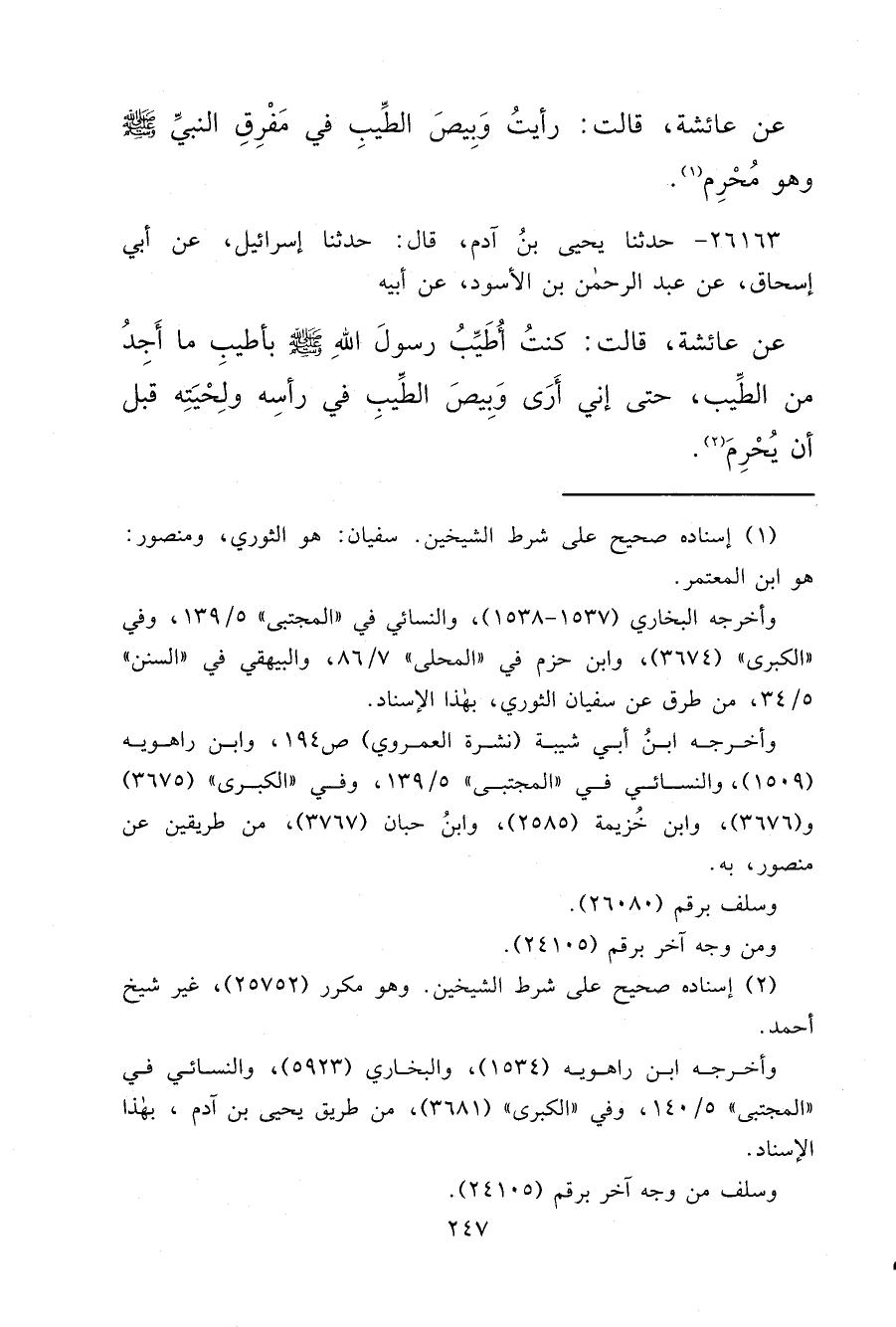 ٢٦١٦٣ - حَدَّثَنَا يَحْيَى بْنُ آدَمَ، قَالَ: حَدَّثَنَا إِسْرَائِيلُ، عَنْ أَبِي إِسْحَاقَ، عَنْ عَبْدِ الرَّحْمَنِ بْنِ الْأَسْوَدِ، عَنْ أَبِيهِ، عَنْ عَائِشَةَ، قَالَتْ: " كُنْتُ أُطَيِّبُ رَسُولَ اللهِ صَلَّى اللهُ عَلَيْهِ وَسَلَّمَ بِأَطْيَبِ مَا أَجِدُ مِنَ الطِّيبِ، حَتَّى أَنِّي أَرَى وَبِيصَ الطِّيبِ فِي رَأْسِهِ وَلِحْيَتِهِ قَبْلَ أَنْ يُحْرِمَ " (٢)