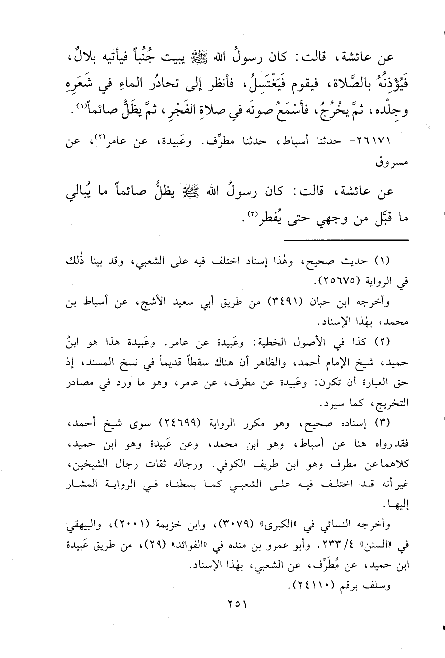 ٢٦١٧١ - حَدَّثَنَا أَسْبَاطٌ، حَدَّثَنَا مُطَرِّفٌ، وعَبيدة عَنْ عَامِرٍ، (٢) عَنْ مَسْرُوقٍ، عَنْ عَائِشَةَ، قَالَتْ: " كَانَ رَسُولُ اللهِ صَلَّى اللهُ عَلَيْهِ وَسَلَّمَ يَظَلُّ صَائِمًا مَا يُبَالِي، مَا قَبَّلَ مِنْ وَجْهِي حَتَّى يُفْطِرَ " (٣)