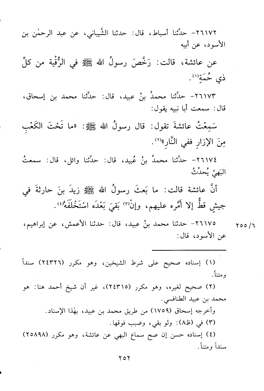 ٢٦١٧٢ - حَدَّثَنَا أَسْبَاطٌ، قَالَ: حَدَّثَنَا الشَّيْبَانِيُّ، عَنْ عَبْدِ الرَّحْمَنِ بْنِ الْأَسْوَدِ، عَنْ أَبِيهِ، عَنْ عَائِشَةَ، قَالَتْ: " رَخَّصَ رَسُولُ اللهِ صَلَّى اللهُ عَلَيْهِ وَسَلَّمَ فِي الرُّقْيَةِ مِنْ كُلِّ ذِي حُمَةٍ " (١)