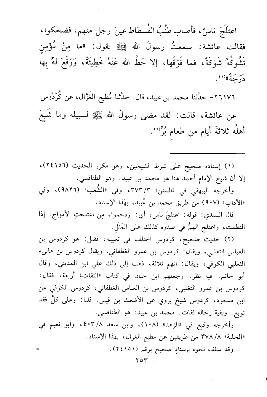 اعْتَلَجَ نَاسٌ فَأَصَابَ طُنُبُ الْفُسْطَاطِ عَيْنَ رَجُلٍ مِنْهُمْ فَضَحِكُوا فَقَالَتْ عَائِشَةُ سَمِعْتُ رَسُولَ اللهِ صَلَّى اللهُ عَلَيْهِ وَسَلَّمَ يَقُولُ: " مَا مِنْ مُؤْمِنٍ تَشُوكُهُ شَوْكَةٌ، فَمَا فَوْقَهَا إِلَّا حَطَّ اللهُ عَنْهُ خَطِيئَةً، وَرَفَعَ لَهُ بِهَا دَرَجَةً " (١)