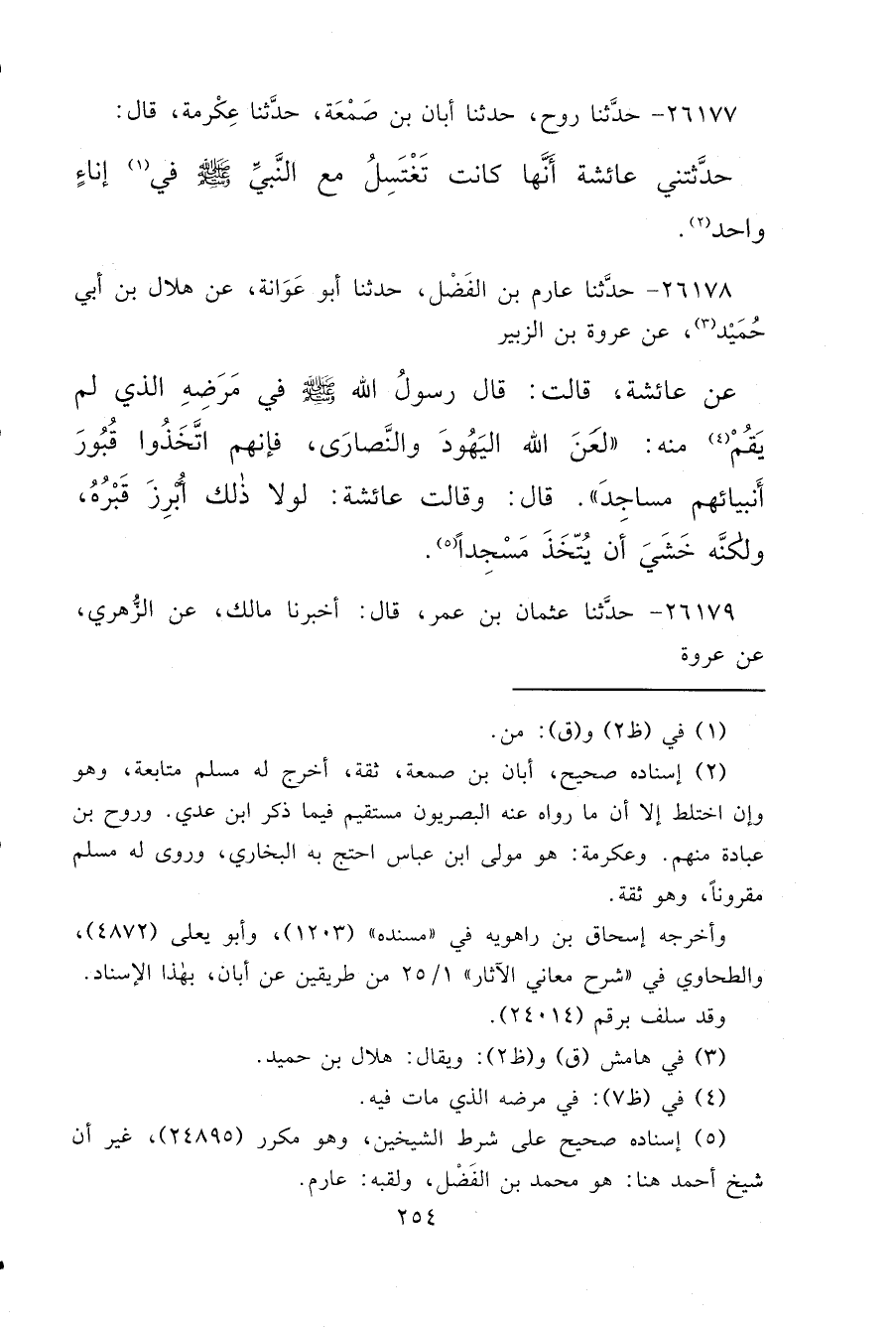 ٢٦١٧٨ - حَدَّثَنَا عَارِمُ بْنُ الْفَضْلِ، حَدَّثَنَا أَبُو عَوَانَةَ، عَنْ هِلَالِ بْنِ أَبِي حُمَيْدٍ (٣) ، عَنْ عُرْوَةَ بْنِ الزُّبَيْرِ، عَنْ عَائِشَةَ، قَالَتْ: قَالَ رَسُولُ اللهِ صَلَّى اللهُ عَلَيْهِ وَسَلَّمَ فِي مَرَضِهِ الَّذِي لَمْ يَقُمْ (٤) مِنْهُ: " لَعَنَ اللهُ الْيَهُودَ، وَالنَّصَارَى فَإِنَّهُمُ اتَّخَذُوا قُبُورَ أَنْبِيَائِهِمْ مَسَاجِدَ " قَالَ: وَقَالَتْ عَائِشَةُ لَوْلَا ذَلِكَ أَبْرَزَ قَبْرَهُ، وَلَكِنَّهُ خَشِيَ أَنْ يُتَّخَذَ مَسْجِدًا (٥)