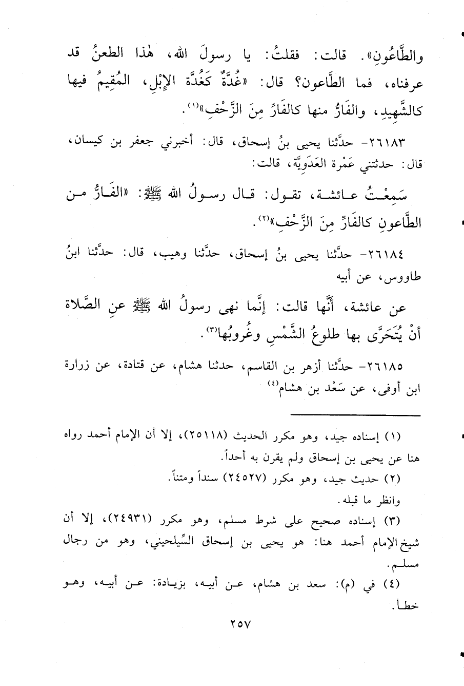 ٢٦١٨٣ - حَدَّثَنَا يَحْيَى بْنُ إِسْحَاقَ، قَالَ: أَخْبَرَنِي جَعْفَرُ بْنُ كَيْسَانَ، قَالَ: حَدَّثَتْنِي عَمْرَةُ الْعَدَوِيَّةُ، قَالَتْ: سَمِعْتُ عَائِشَةَ، تَقُولُ: قَالَ رَسُولُ اللهِ صَلَّى اللهُ عَلَيْهِ وَسَلَّمَ: " الْفَارُّ مِنَ الطَّاعُونِ، كَالْفَارِّ مِنَ الزَّحْفِ " (٢)