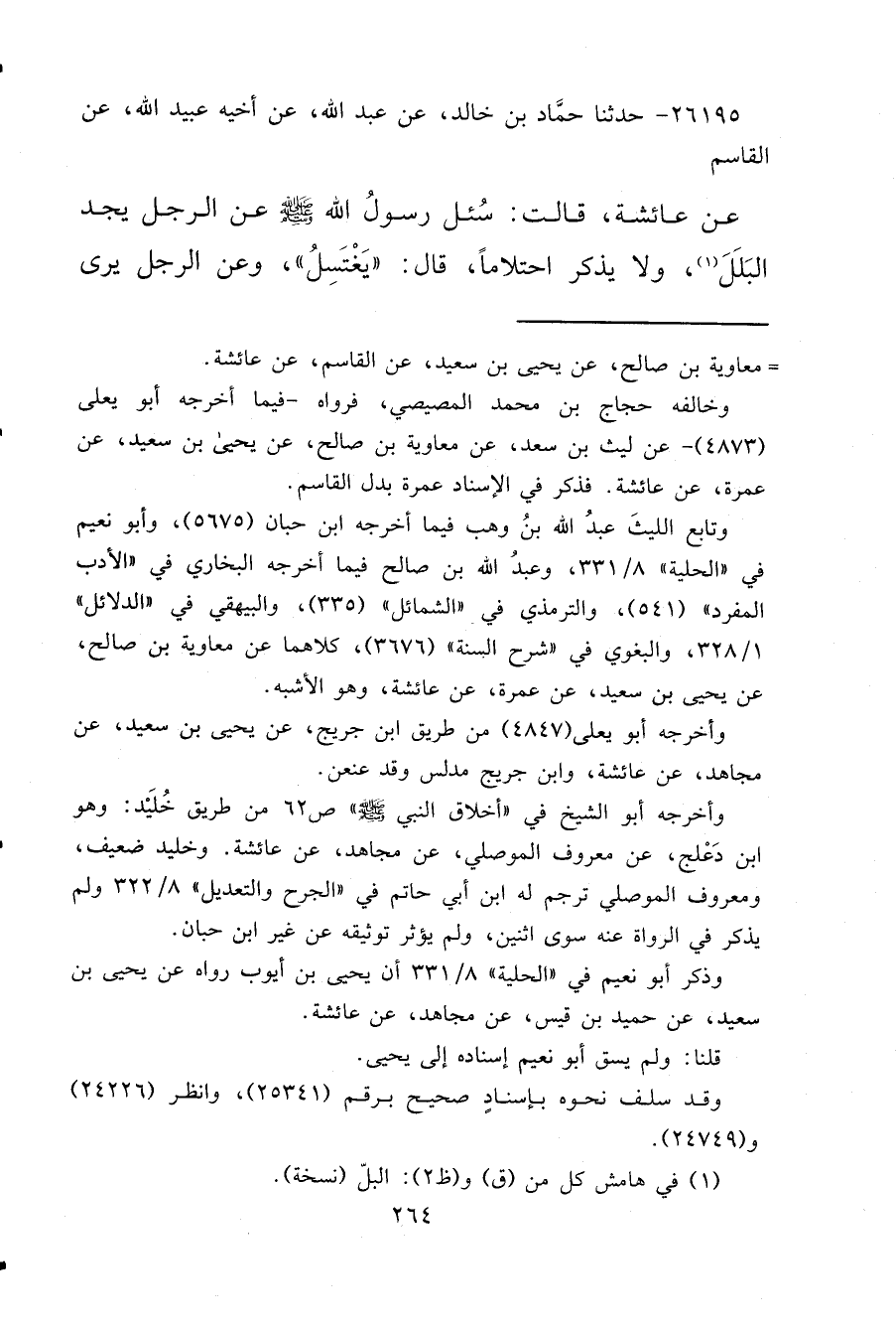 ٢٦١٩٥ - حَدَّثَنَا حَمَّادُ بْنُ خَالِدٍ، عَنْ عَبْدِ اللهِ، عَنْ أَخِيهِ، عُبَيْدِ اللهِ عَنِ الْقَاسِمِ، عَنْ عَائِشَةَ، قَالَتْ: سُئِلَ رَسُولُ اللهِ صَلَّى اللهُ عَلَيْهِ وَسَلَّمَ عَنِ الرَّجُلِ يَجِدُ الْبَلَلَ (١) وَلَا يَذْكُرُ احْتِلَامًا قَالَ: " يَغْتَسِلُ "، وَعَنِ الرَّجُلِ يَرَى