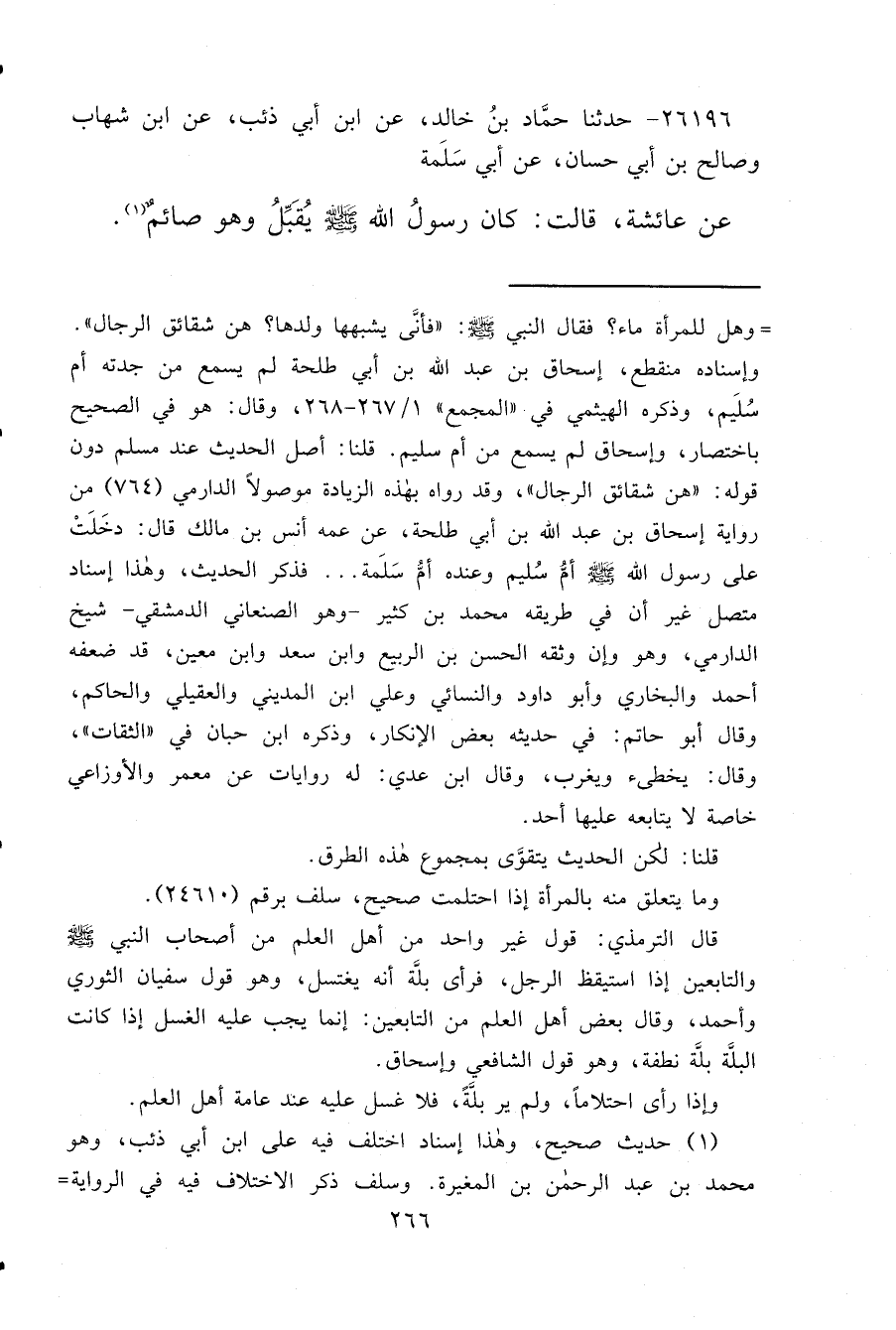 ٢٦١٩٦ - حَدَّثَنَا حَمَّادُ بْنُ خَالِدٍ، عَنِ ابْنِ أَبِي ذِئْبٍ، عَنِ ابْنِ شِهَابٍ، وَصَالِحِ بْنِ أَبِي حَسَّانَ، عَنْ أَبِي سَلَمَةَ، عَنْ عَائِشَةَ، قَالَتْ: " كَانَ رَسُولُ اللهِ صَلَّى اللهُ عَلَيْهِ وَسَلَّمَ يُقَبِّلُ وَهُوَ صَائِمٌ " (١)