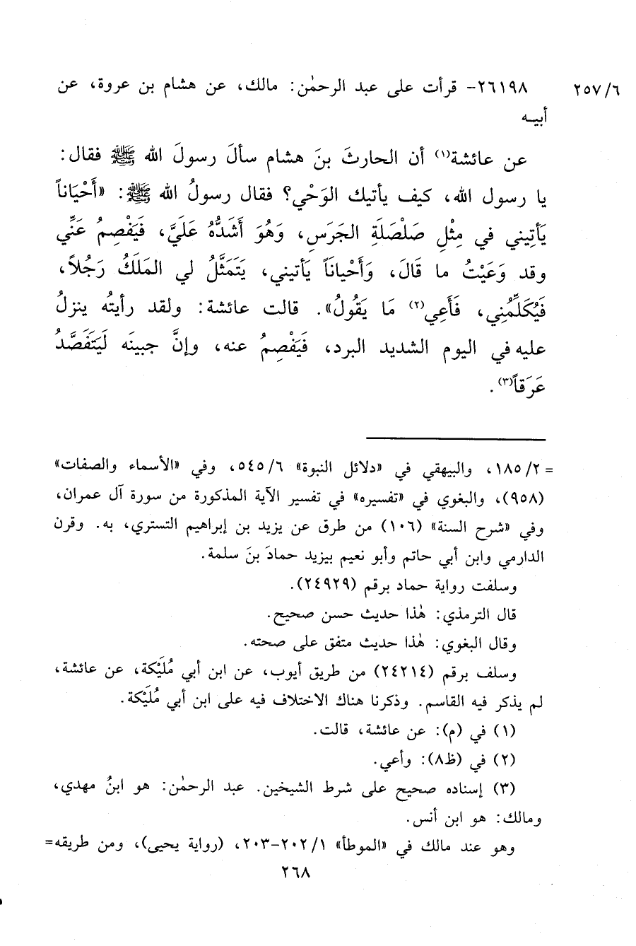 ٢٦١٩٨ - قَرَأْتُ عَلَى عَبْدِ الرَّحْمَنِ: مَالِكٌ، عَنْ هِشَامِ بْنِ عُرْوَةَ، عَنْ أَبِيهِ، عَنْ عَائِشَةَ (١) : أَنَّ الْحَارِثَ بْنَ هِشَامٍ سَأَلَ رَسُولَ اللهِ صَلَّى اللهُ عَلَيْهِ وَسَلَّمَ فَقَالَ: يَا رَسُولَ اللهِ كَيْفَ يَأْتِيكَ الْوَحْيُ فَقَالَ رَسُولُ اللهِ صَلَّى اللهُ عَلَيْهِ وَسَلَّمَ: " أَحْيَانًا يَأْتِينِي فِي مِثْلِ صَلْصَلَةِ الْجَرَسِ، وَهُوَ أَشَدُّهُ عَلَيَّ، فَيَفْصِمُ عَنِّي وَقَدْ وَعَيْتُ مَا قَالَ، وَأَحْيَانًا يَأْتِينِي، يَتَمَثَّلُ لِي الْمَلَكُ رَجُلًا، فَيُكَلِّمُنِي، فَأَعِي (٢) مَا يَقُولُ " قَالَتْ عَائِشَةُ: وَلَقَدْ رَأَيْتُهُ يَنْزِلُ عَلَيْهِ فِي الْيَوْمِ الشَّدِيدِ الْبَرْدِ فَيَفْصِمُ عَنْهُ وَإِنَّ جَبِينَهُ لَيَتَفَصَّدُ عَرَقًا (٣)
