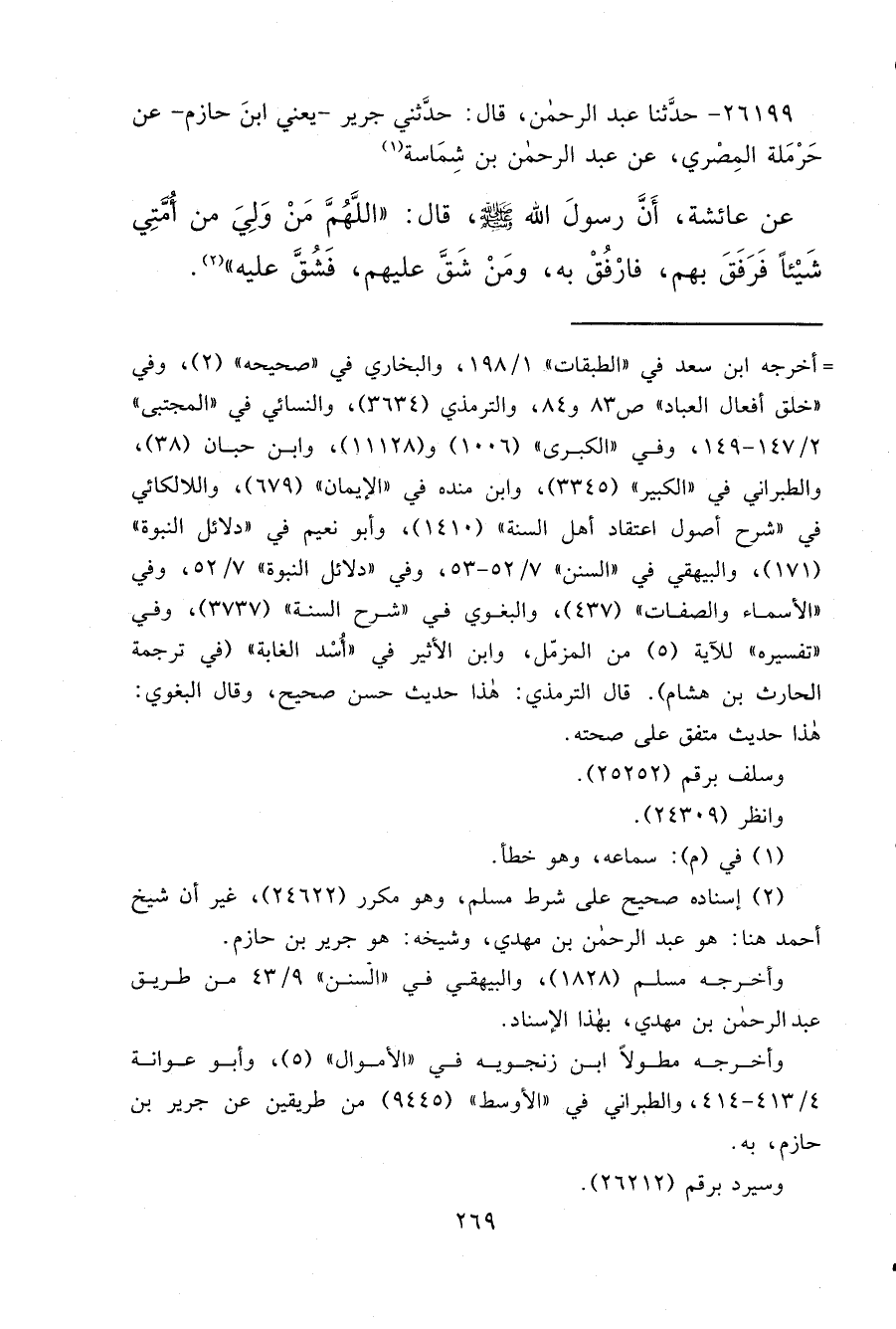 ٢٦١٩٩ - حَدَّثَنَا عَبْدُ الرَّحْمَنِ، قَالَ: حَدَّثَنِي جَرِيرٌ يَعْنِي ابْنَ حَازِمٍ، عَنْ حَرْمَلَةَ الْمِصْرِيِّ، عَنْ عَبْدِ الرَّحْمَنِ بْنِ شِمَاسَةَ (١) ، عَنْ عَائِشَةَ، أَنَّ رَسُولَ اللهِ صَلَّى اللهُ عَلَيْهِ وَسَلَّمَ قَالَ: " اللهُمَّ مَنْ وَلِيَ مِنْ أُمَّتِي شَيْئًا فَرَفَقَ بِهِمْ، فَارْفُقْ بِهِ، وَمَنْ شَقَّ عَلَيْهِمْ، فَشُقَّ عَلَيْهِ " (٢)