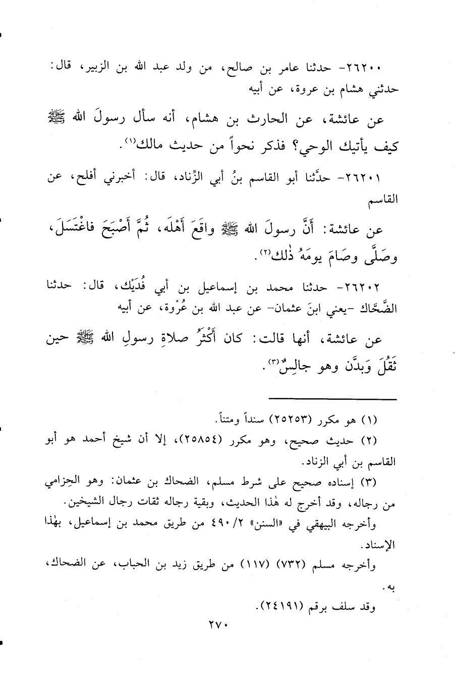 ٢٦٢٠٢ - حَدَّثَنَا مُحَمَّدُ بْنُ إِسْمَاعِيلَ بْنِ أَبِي فُدَيْكٍ، قَالَ: حَدَّثَنَا الضَّحَّاكُ يَعْنِي ابْنَ عُثْمَانَ، عَنْ عَبْدِ اللهِ بْنِ عُرْوَةَ، عَنْ أَبِيهِ، عَنْ عَائِشَةَ، أَنَّهَا قَالَتْ: " كَانَ أَكْثَرُ صَلَاةِ رَسُولِ اللهِ صَلَّى اللهُ عَلَيْهِ وَسَلَّمَ حِينَ ثَقُلَ وَبَدَّنَ وَهُوَ جَالِسٌ " (٣)