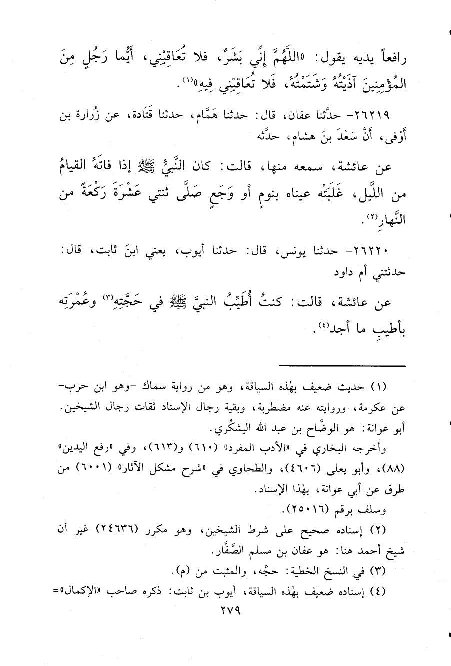 رَافِعًا يَدَيْهِ يَقُولُ: " اللهُمَّ إِنِّي بَشَرٌ فَلَا تُعَاقِبْنِي، أَيُّمَا رَجُلٍ مِنَ الْمُؤْمِنِينَ آذَيْتُهُ وَشَتَمْتُهُ، فَلَا تُعَاقِبْنِي فِيهِ " (١)