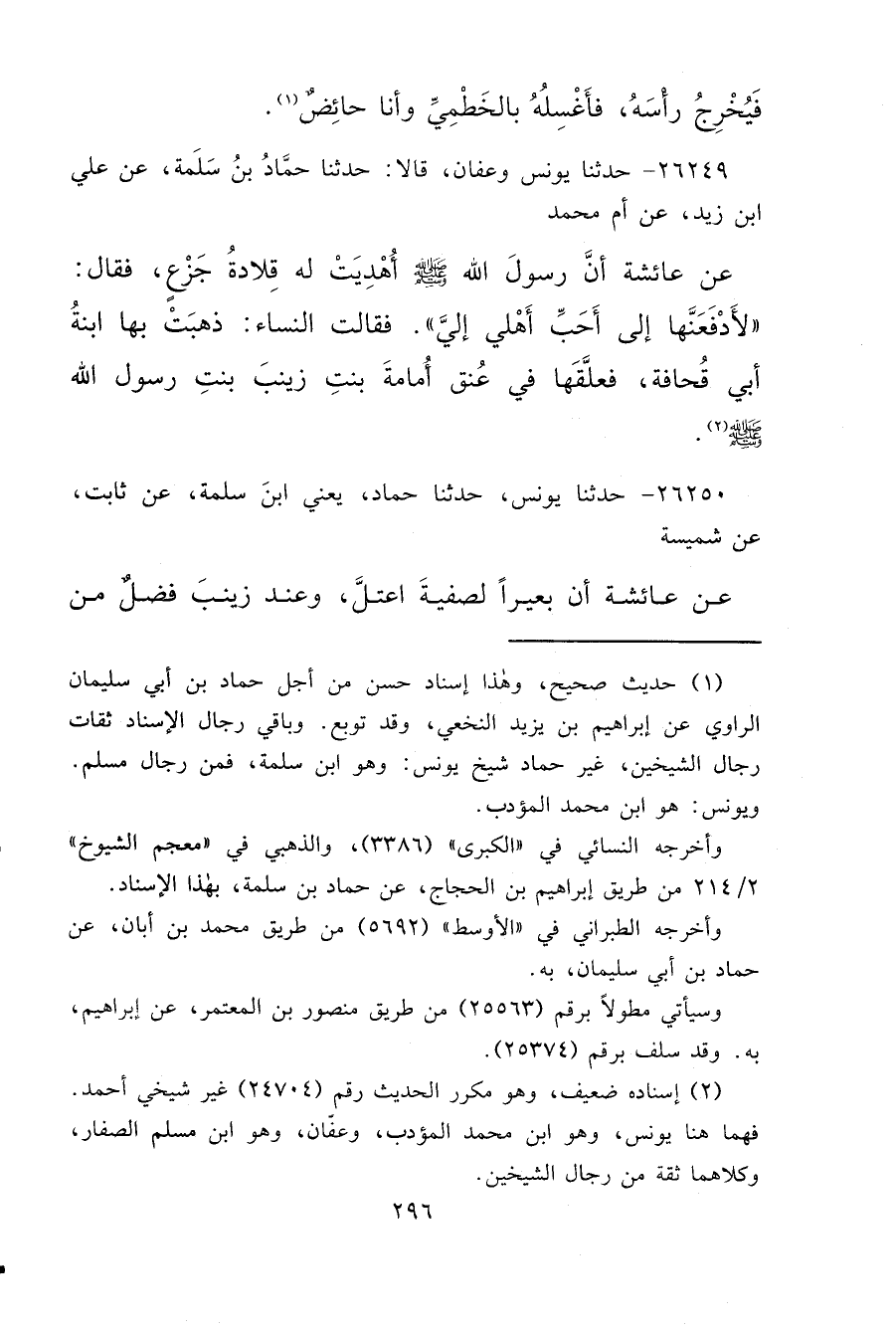 ٢٦٢٥٠ - حَدَّثَنَا يُونُسُ، حَدَّثَنَا حَمَّادٌ يَعْنِي ابْنَ سَلَمَةَ، عَنْ ثَابِتٍ، عَنْ شُمَيْسَةَ، عَنْ عَائِشَةَ، أَنَّ بَعِيرًا لِصَفِيَّةَ اعْتَلَّ، وَعِنْدَ زَيْنَبَ فَضْلٌ مِنَ