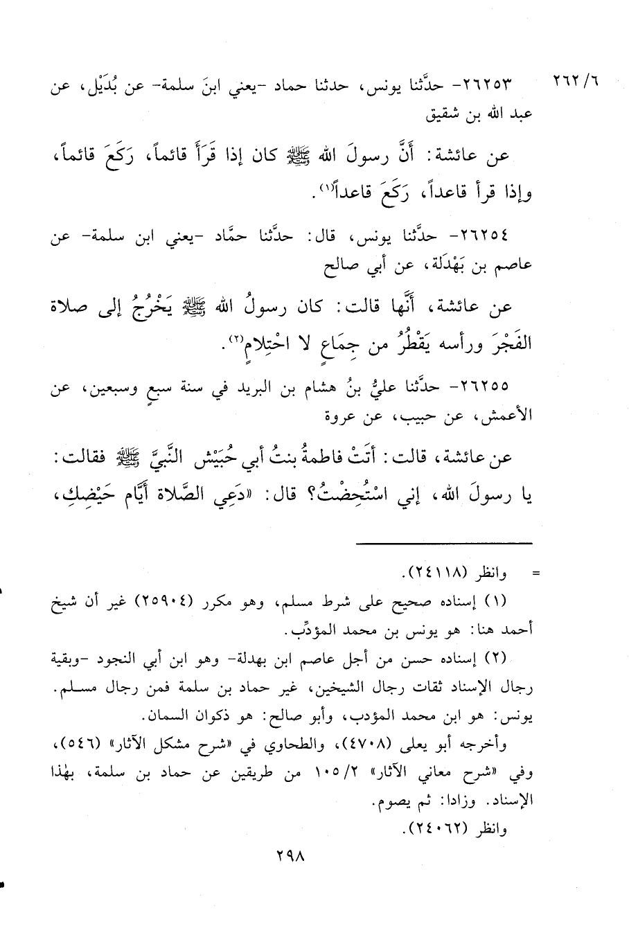 ٢٦٢٥٤ - حَدَّثَنَا يُونُسُ، قَالَ: حَدَّثَنَا حَمَّادٌ يَعْنِي ابْنَ سَلَمَةَ، عَنْ عَاصِمِ بْنِ بَهْدَلَةَ، عَنْ أَبِي صَالِحٍ، عَنْ عَائِشَةَ، أَنَّهَا قَالَتْ: " كَانَ رَسُولُ اللهِ صَلَّى اللهُ عَلَيْهِ وَسَلَّمَ يَخْرُجُ إِلَى صَلَاةِ الْفَجْرِ وَرَأْسُهُ يَقْطُرُ مِنْ جِمَاعٍ لَا احْتِلَامٍ " (٢)
