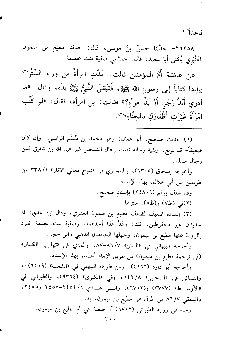 ٢٦٢٥٨ - حَدَّثَنَا حَسَنُ بْنُ مُوسَى، قَالَ: حَدَّثَنَا مُطِيعُ بْنُ مَيْمُونٍ الْعَنْبَرِيُّ، يُكْنَى أبَا سَعِيدٍ، قَالَ: حَدَّثَتْنِي صَفِيَّةُ بِنْتُ عِصْمَةَ، عَنْ عَائِشَةَ أُمِّ الْمُؤْمِنِينَ، قَالَتْ: مَدَّتْ امْرَأَةٌ مِنْ وَرَاءِ السِّتْرِ (٢) بِيَدِهَا كِتَابًا إِلَى رَسُولِ اللهِ صَلَّى اللهُ عَلَيْهِ وَسَلَّمَ فَقَبَضَ النَّبِيُّ صَلَّى اللهُ عَلَيْهِ وَسَلَّمَ يَدَهُ، وَقَالَ: " مَا أَدْرِي أَيَدُ رَجُلٍ أَوْ يَدُ امْرَأَةٍ؟ " فَقَالَتْ: بَلْ امْرَأَةٌ، فَقَالَ: " لَوْ كُنْتِ امْرَأَةً غَيَّرْتِ أَظْفَارَكِ بِالْحِنَّاءِ " (٣)