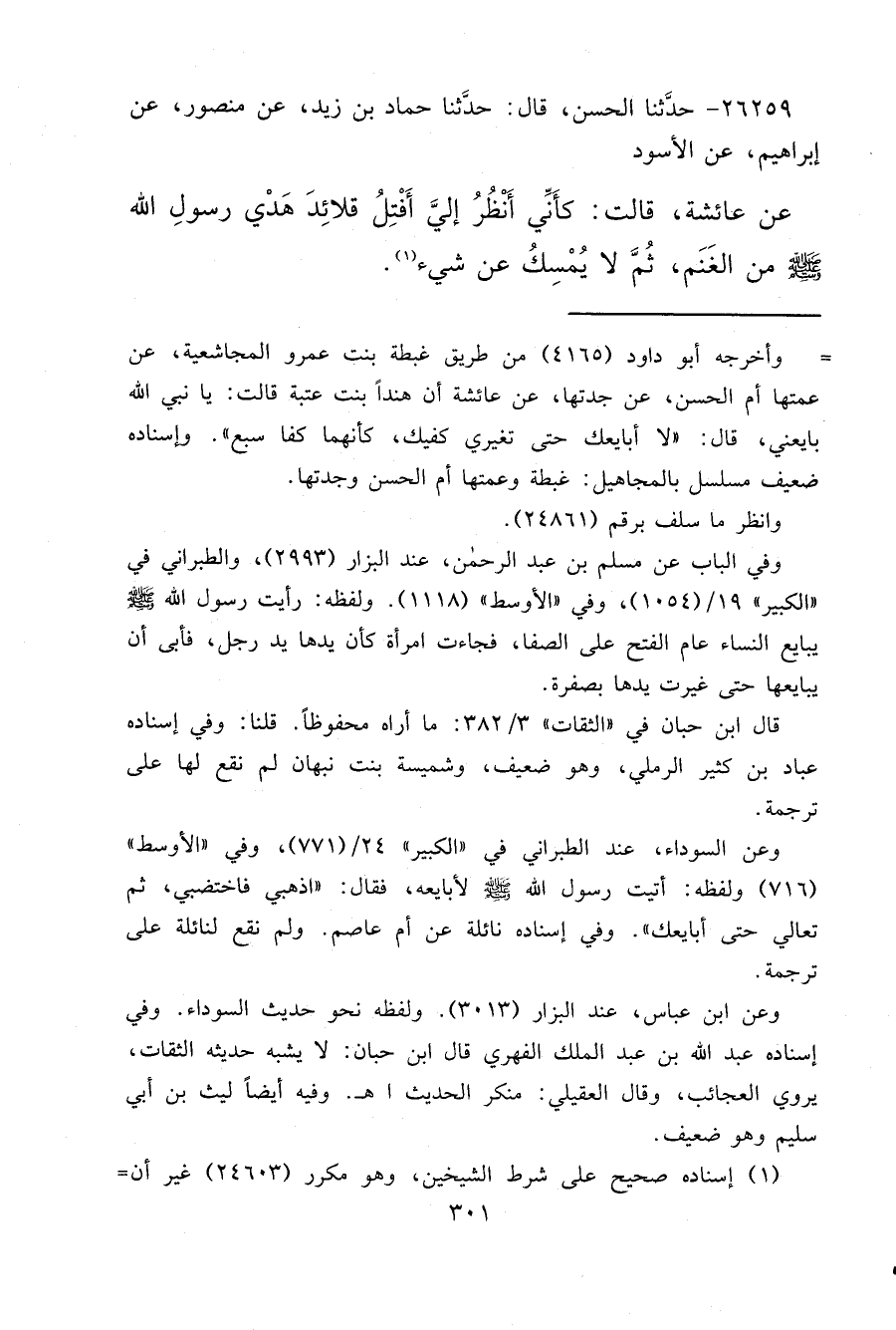٢٦٢٥٩ - حَدَّثَنَا الْحَسَنُ، قَالَ: حَدَّثَنَا حَمَّادُ بْنُ زَيْدٍ، عَنْ مَنْصُورٍ، عَنْ إِبْرَاهِيمَ، عَنْ الْأَسْوَدِ، عَنْ عَائِشَةَ، قَالَتْ: كَأَنِّي أَنْظُرُ إِلَيَّ " أَفْتِلُ قَلَائِدَ هَدْيِ رَسُولِ اللهِ صَلَّى اللهُ عَلَيْهِ وَسَلَّمَ مِنَ الْغَنَمِ، ثُمَّ لَا يُمْسِكُ عَنْ شَيْءٍ " (١)