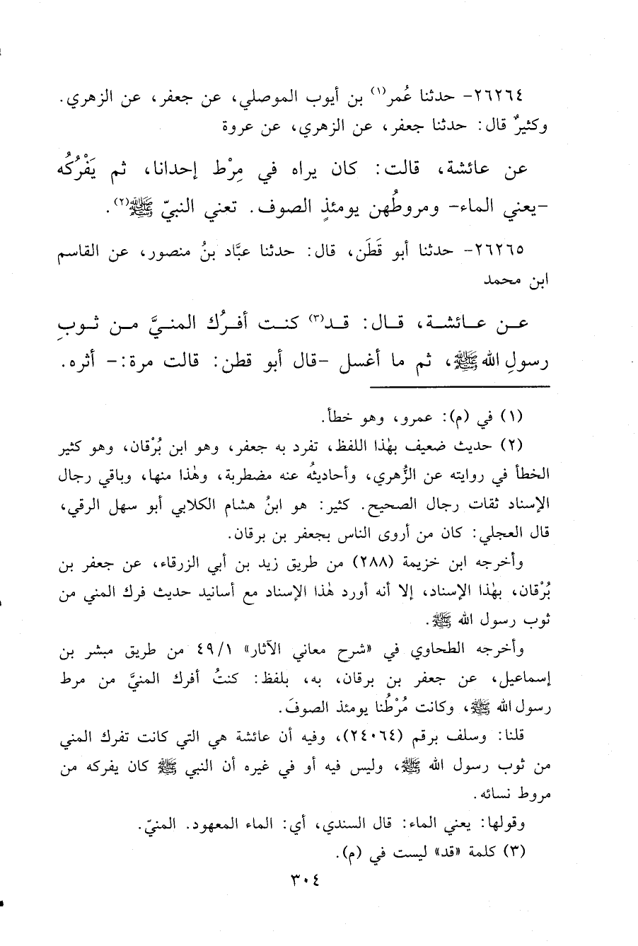 ٢٦٢٦٤ - حَدَّثَنَا عُمَرُ (١) بْنُ أَيُّوبَ الْمَوْصِلِيُّ، عَنْ جَعْفَرٍ، عَنِ الزُّهْرِيِّ، وَكَثِيرٌ، قَالَ: حَدَّثَنَا جَعْفَرٌ، عَنِ الزُّهْرِيِّ، عَنْ عُرْوَةَ، عَنْ عَائِشَةَ، قَالَتْ: " كَانَ يَرَاهُ فِي مِرْطِ إِحْدَانَا، ثُمَّ يَفْرُكُهُ، يَعْنِي الْمَاءَ، وَمُرُوطُهُنَّ يَوْمَئِذٍ الصُّوفُ. تَعْنِي النَّبِيَّ صَلَّى اللهُ عَلَيْهِ وَسَلَّمَ " (٢)