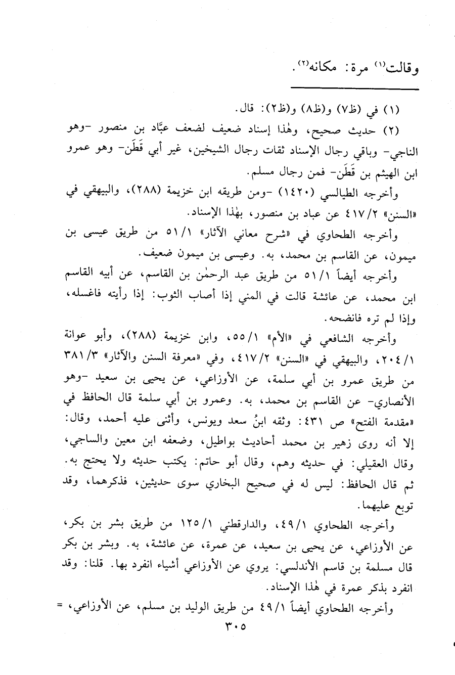 وأخرجه أيضاً ١/٥١ من طريق عبد الرحمن بن القاسم، عن أبيه القاسم ابن محمد، عن عائشة قالت في المني إذا أصاب الثوب: إذا رأيته فاغسله، وإذا لم تره فانضحه.