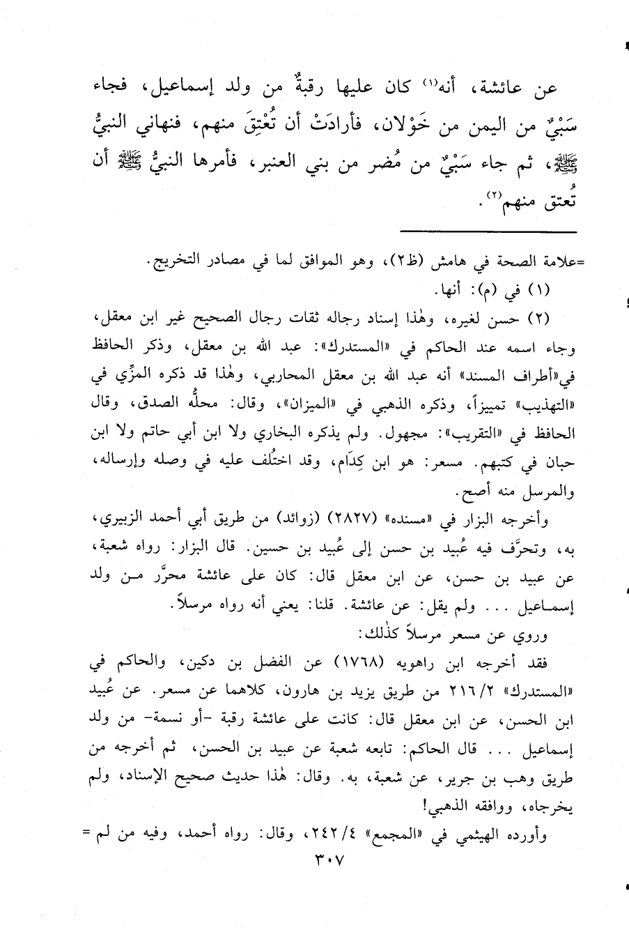 عَنْ عَائِشَةَ، أَنَّهُ (١) كَانَ عَلَيْهَا رَقَبَةٌ مِنْ وَلَدِ إِسْمَاعِيلَ، فَجَاءَ سَبْيٌ مِنَ الْيَمَنِ مِنْ خَوْلَانَ، فَأَرَادَتْ أَنْ تَعْتِقَ مِنْهُمْ، فَنَهَانِي النَّبِيُّ صَلَّى اللهُ عَلَيْهِ وَسَلَّمَ، ثُمَّ جَاءَ سَبْيٌ مِنْ مُضَرَ مِنْ بَنِي الْعَنْبَرِ، " فَأَمَرَهَا النَّبِيُّ صَلَّى اللهُ عَلَيْهِ وَسَلَّمَ أَنْ تَعْتِقَ مِنْهُمْ " (٢)