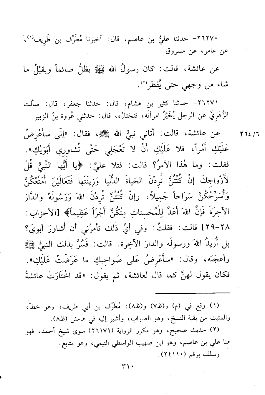 ٢٦٢٧١ - حَدَّثَنَا كَثِيرُ بْنُ هِشَامٍ، قَالَ: حَدَّثَنَا جَعْفَرٌ، قَالَ: سَأَلْتُ الزُّهْرِيَّ عَنِ الرَّجُلِ يُخَيِّرُ امْرَأَتَهُ فَتَخْتَارُهُ قَالَ حَدَّثَنِي عُرْوَةُ بْنُ الزُّبَيْرِ، عَنْ عَائِشَةَ، قَالَتْ: أَتَانِي نَبِيُّ اللهِ صَلَّى اللهُ عَلَيْهِ وَسَلَّمَ، فَقَالَ: " إِنِّي سَأَعْرِضُ عَلَيْكِ أَمْرًا، فَلَا عَلَيْكِ أَنْ لَا تَعْجَلِي حَتَّى تُشَاوِرِي أَبَوَيْكِ " فَقُلْتُ: وَمَا هَذَا الْأَمْرُ؟ قَالَتْ: فَتَلَا عَلَيَّ: {يَا أَيُّهَا النَّبِيُّ قُلْ لِأَزْوَاجِكَ إِنْ كُنْتُنَّ تُرِدْنَ الْحَيَاةَ الدُّنْيَا وَزِينَتَهَا فَتَعَالَيْنَ أُمَتِّعْكُنَّ وَأُسَرِّحْكُنَّ سَرَاحًا جَمِيلًا وَإِنْ كُنْتُنَّ تُرِدْنَ اللهَ وَرَسُولَهُ وَالدَّارَ الْآخِرَةَ فَإِنَّ اللهَ أَعَدَّ لِلْمُحْسِنَاتِ مِنْكُنَّ أَجْرًا عَظِيمًا} [الأحزاب: ٢٩] قَالَتْ: فَقُلْتُ: وَفِي أَيِّ ذَلِكَ تَأْمُرُنِي أَنْ أُشَاوِرَ أَبَوَيَّ؟ بَلْ أُرِيدُ اللهَ وَرَسُولَهُ وَالدَّارَ الْآخِرَةَ، قَالَتْ: فَسُرَّ بِذَلِكَ النَّبِيُّ صَلَّى اللهُ عَلَيْهِ وَسَلَّمَ وَأَعْجَبَهُ، وَقَالَ: " سَأَعْرِضُ عَلَى صَوَاحِبِكِ مَا عَرَضْتُ عَلَيْكِ " فَكَانَ يَقُولُ لَهُنَّ كَمَا قَالَ لِعَائِشَةَ، ثُمَّ يَقُولُ: " قَدْ اخْتَارَتْ عَائِشَةُ