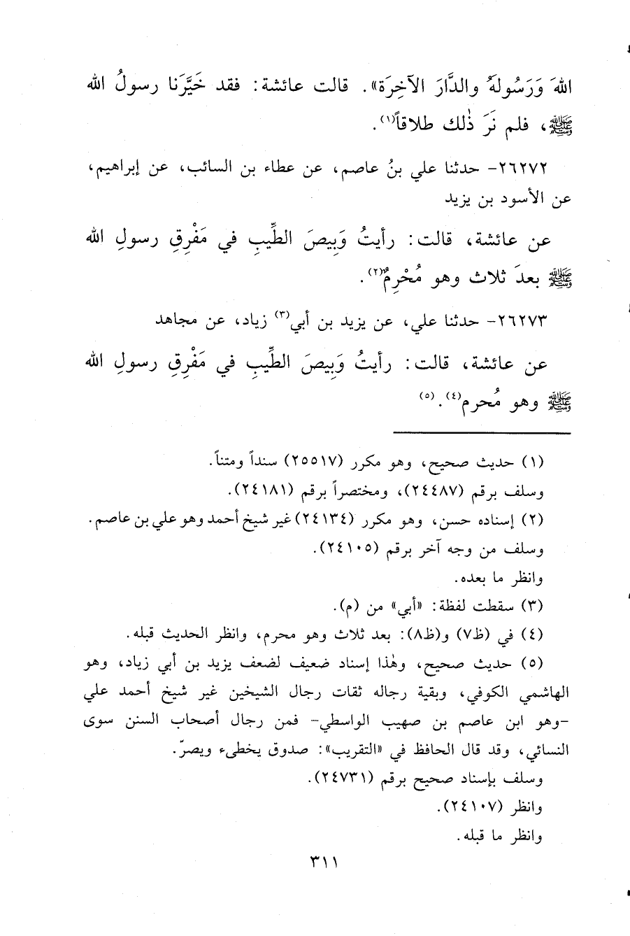 ٢٦٢٧٢ - حَدَّثَنَا عَلِيُّ بْنُ عَاصِمٍ، عَنْ عَطَاءِ بْنِ السَّائِبِ، عَنْ إِبْرَاهِيمَ، عَنِ الْأَسْوَدِ بْنِ يَزِيدَ، عَنْ عَائِشَةَ، قَالَتْ: " رَأَيْتُ وَبِيصَ الطِّيبِ فِي مَفْرِقِ رَسُولِ اللهِ صَلَّى اللهُ عَلَيْهِ وَسَلَّمَ وَهُوَ مُحْرِمٌ " (٢)