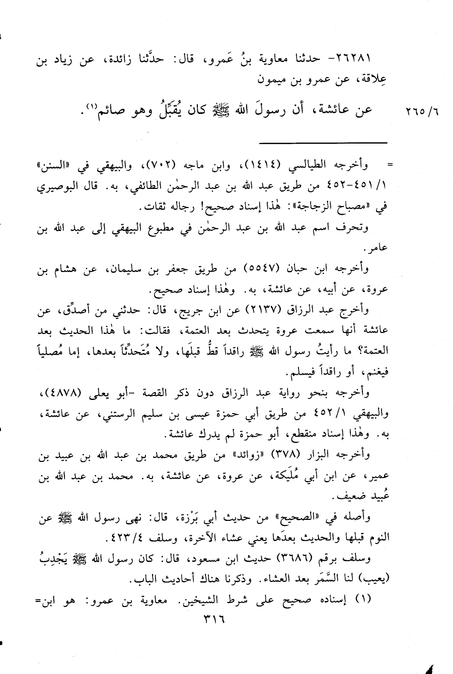 ٢٦٢٨١ - حَدَّثَنَا مُعَاوِيَةُ بْنُ عَمْرٍو، قَالَ: حَدَّثَنَا زَائِدَةُ، عَنْ زِيَادِ بْنِ عِلَاقَةَ، عَنْ عَمْرِو بْنِ مَيْمُونٍ، عَنْ عَائِشَةَ، " أَنَّ رَسُولَ اللهِ صَلَّى اللهُ عَلَيْهِ وَسَلَّمَ كَانَ يُقَبِّلُ وَهُوَ صَائِمٌ " (١)