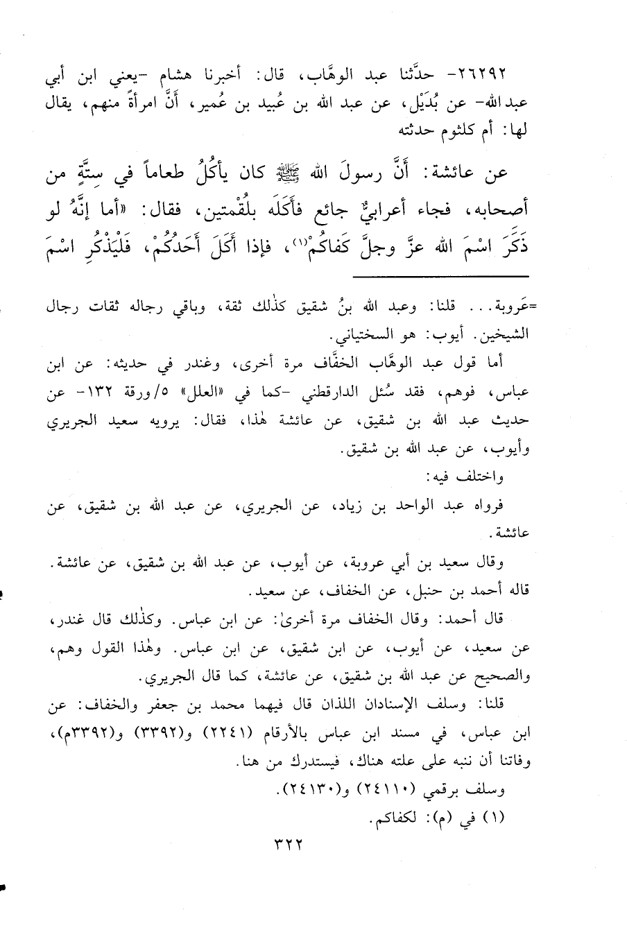 ٢٦٢٩٢ - حَدَّثَنَا عَبْدُ الْوَهَّابِ، قَالَ: أَخْبَرَنَا هِشَامٌ يَعْنِي ابْنَ أَبِي عَبْدِ اللهِ، عَنْ بُدَيْلٍ، عَنْ عَبْدِ اللهِ بْنِ عُبَيْدِ بْنِ عُمَيْرٍ، أَنَّ امْرَأَةً، مِنْهُمْ يُقَالُ لَهَا: أُمُّ كُلْثُومٍ، حَدَّثَتْهُ عَنْ عَائِشَةَ أَنَّ رَسُولَ اللهِ صَلَّى اللهُ عَلَيْهِ وَسَلَّمَ كَانَ يَأْكُلُ طَعَامًا فِي سِتَّةٍ مِنْ أَصْحَابِهِ، فَجَاءَ أَعْرَابِيٌّ جَائِعٌ فَأَكَلَهُ بِلُقْمَتَيْنِ، فَقَالَ: " أَمَا إِنَّهُ لَوْ ذَكَرَ اسْمَ اللهِ عَزَّ وَجَلَّ كَفَاكُمْ (١) فَإِذَا أَكَلَ أَحَدُكُمْ، فَلْيَذْكُرْ اسْمَ