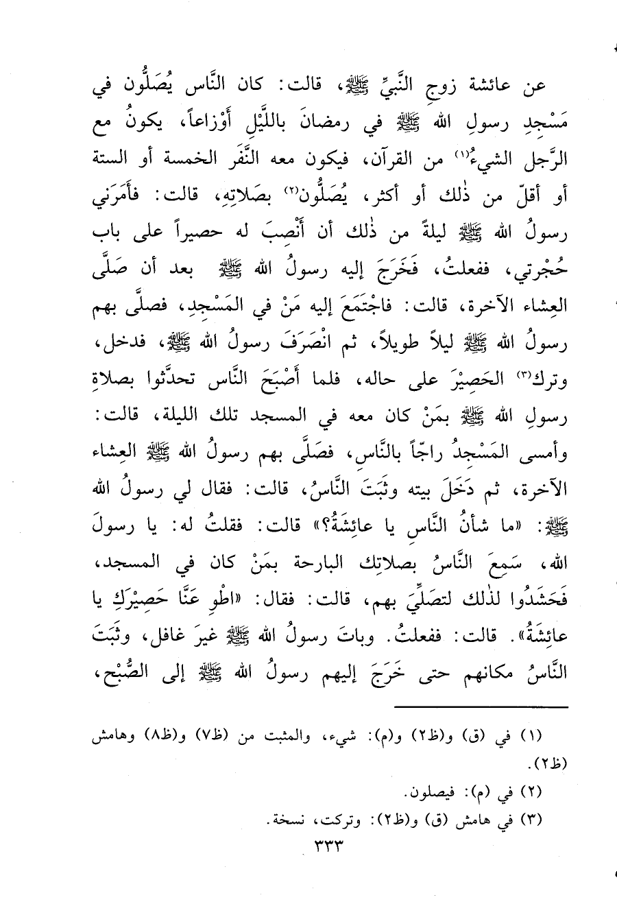 عَنْ عَائِشَةَ، زَوْجِ النَّبِيِّ صَلَّى اللهُ عَلَيْهِ وَسَلَّمَ قَالَتْ: كَانَ النَّاسُ يُصَلُّونَ فِي مَسْجِدِ رَسُولِ اللهِ صَلَّى اللهُ عَلَيْهِ وَسَلَّمَ فِي رَمَضَانَ بِاللَّيْلِ أَوْزَاعًا، يَكُونُ مَعَ الرَّجُلِ الشَّيْءُ (١) مِنَ الْقُرْآنِ، فَيَكُونُ مَعَهُ النَّفَرُ الْخَمْسَةُ أَوِ السِّتَّةُ أَوْ أَقَلُّ مِنْ ذَلِكَ أَوْ أَكْثَرُ، يُصَلُّونَ (٢) بِصَلَاتِهِ، قَالَتْ: فَأَمَرَنِي رَسُولُ اللهِ صَلَّى اللهُ عَلَيْهِ وَسَلَّمَ لَيْلَةً مِنْ ذَلِكَ أَنْ أَنْصِبَ لَهُ حَصِيرًا عَلَى بَابِ حُجْرَتِي، فَفَعَلْتُ، فَخَرَجَ إِلَيْهِ رَسُولُ اللهِ صَلَّى اللهُ عَلَيْهِ وَسَلَّمَ بَعْدَ أَنْ صَلَّى الْعِشَاءَ الْآخِرَةَ، قَالَتْ: فَاجْتَمَعَ إِلَيْهِ مَنْ فِي الْمَسْجِدِ، فَصَلَّى بِهِمْ رَسُولُ اللهِ صَلَّى اللهُ عَلَيْهِ وَسَلَّمَ لَيْلًا طَوِيلًا، ثُمَّ انْصَرَفَ رَسُولُ اللهِ صَلَّى اللهُ عَلَيْهِ وَسَلَّمَ، فَدَخَلَ، وَتَرَكَ (٣) الْحَصِيرَ عَلَى حَالِهِ، فَلَمَّا أَصْبَحَ النَّاسُ تَحَدَّثُوا بِصَلَاةِ رَسُولِ اللهِ صَلَّى اللهُ عَلَيْهِ وَسَلَّمَ بِمَنْ كَانَ مَعَهُ فِي الْمَسْجِدِ تِلْكَ اللَّيْلَةَ، قَالَتْ: وَأَمْسَى الْمَسْجِدُ رَاجًّا بِالنَّاسِ، فَصَلَّى بِهِمْ رَسُولُ اللهِ صَلَّى اللهُ عَلَيْهِ وَسَلَّمَ الْعِشَاءَ الْآخِرَةَ، ثُمَّ دَخَلَ بَيْتَهُ وَثَبَتَ النَّاسُ، قَالَتْ: فَقَالَ لِي رَسُولُ اللهِ صَلَّى اللهُ عَلَيْهِ وَسَلَّمَ: " مَا شَأْنُ النَّاسِ يَا عَائِشَةُ؟ " قَالَتْ: فَقُلْتُ لَهُ: يَا رَسُولَ اللهِ سَمِعَ النَّاسُ بِصَلَاتِكَ الْبَارِحَةَ بِمَنْ كَانَ فِي الْمَسْجِدِ، فَحَشَدُوا لِذَلِكَ لِتُصَلِّيَ بِهِمْ، قَالَتْ: فَقَالَ: " اطْوِ عَنَّا حَصِيرَكِ يَا عَائِشَةُ " قَالَتْ: فَفَعَلْتُ. وَبَاتَ رَسُولُ اللهِ صَلَّى اللهُ عَلَيْهِ وَسَلَّمَ غَيْرَ غَافِلٍ، وَثَبَتَ النَّاسُ مَكَانَهُمْ حَتَّى خَرَجَ رَسُولُ اللهِ صَلَّى اللهُ عَلَيْهِ وَسَلَّمَ إِلَى الصُّبْحِ،
