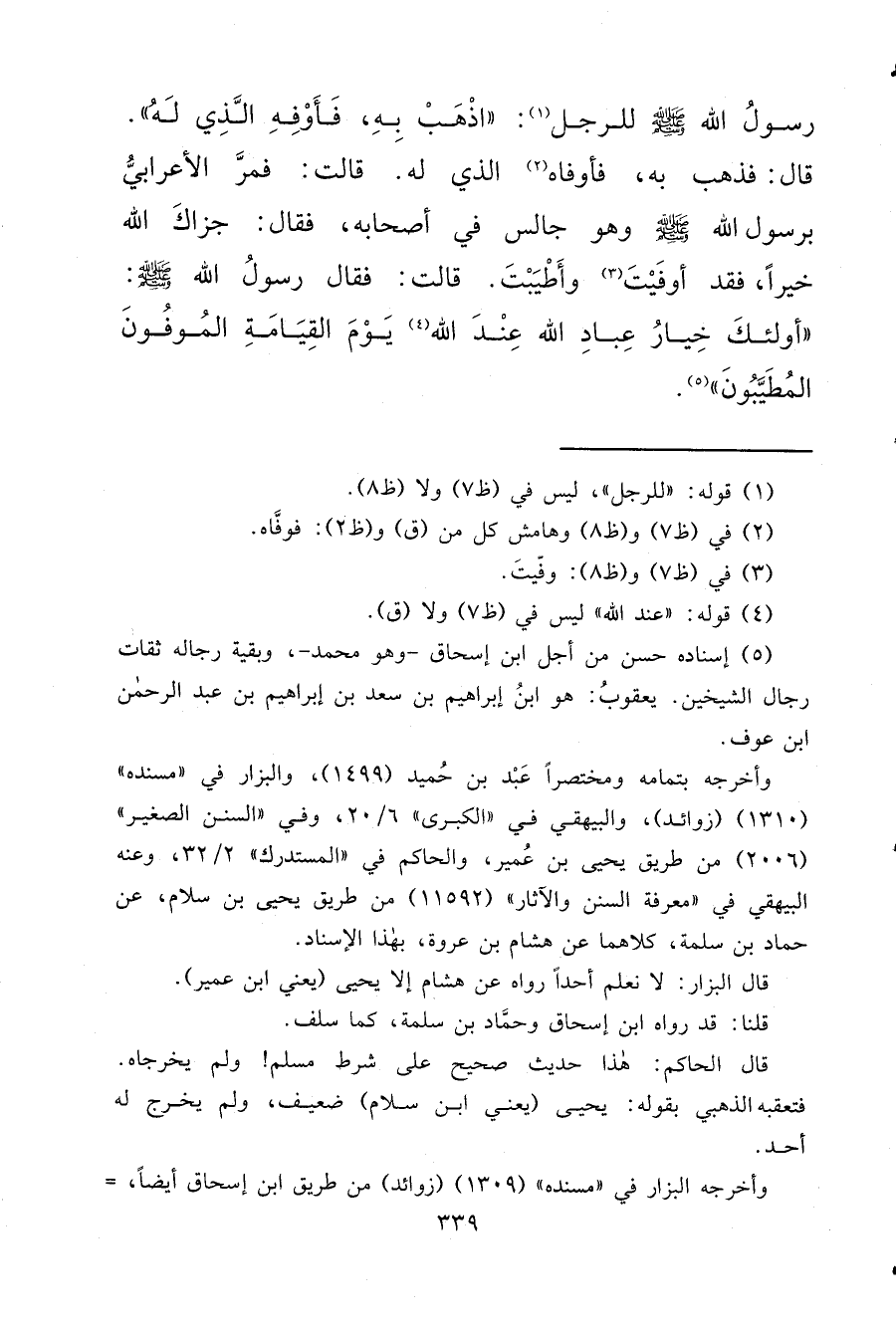 رَسُولُ اللهِ صَلَّى اللهُ عَلَيْهِ وَسَلَّمَ لِلرَّجُلِ: (١) " اذْهَبْ بِهِ، فَأَوْفِهِ الَّذِي لَهُ " قَالَ: فَذَهَبَ بِهِ، فَأَوْفَاهُ (٢) الَّذِي لَهُ. قَالَتْ: فَمَرَّ الْأَعْرَابِيُّ بِرَسُولِ اللهِ صَلَّى اللهُ عَلَيْهِ وَسَلَّمَ وَهُوَ جَالِسٌ فِي أَصْحَابِهِ، فَقَالَ: جَزَاكَ اللهُ خَيْرًا، فَقَدْ أَوْفَيْتَ (٣) وَأَطْيَبْتَ. قَالَتْ: فَقَالَ رَسُولُ اللهِ صَلَّى اللهُ عَلَيْهِ وَسَلَّمَ: " أُولَئِكَ خِيَارُ عِبَادِ اللهِ عِنْدَ اللهِ (٤) يَوْمَ الْقِيَامَةِ الْمُوفُونَ الْمُطِيبُونَ " (٥)