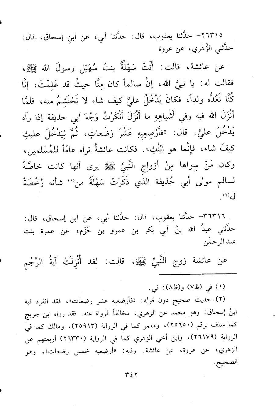٢٦٣١٥ - حَدَّثَنَا يَعْقُوبُ، قَالَ: حَدَّثَنَا أَبِي، عَنِ ابْنِ إِسْحَاقَ، قَالَ: حَدَّثَنِي الزُّهْرِيُّ، عَنْ عُرْوَةَ، عَنْ عَائِشَةَ، قَالَتْ: أَتَتْ سَهْلَةُ بِنْتُ سُهَيْلٍ رَسُولَ اللهِ صَلَّى اللهُ عَلَيْهِ وَسَلَّمَ فَقَالَتْ لَهُ: يَا نَبِيَّ اللهِ إِنَّ سَالِمًا كَانَ مِنَّا حَيْثُ قَدْ عَلِمْتَ، أَنَّا كُنَّا نَعُدُّهُ وَلَدًا، فَكَانَ يَدْخُلُ عَلَيَّ كَيْفَ شَاءَ لَا نَحْتَشِمُ مِنْهُ، فَلَمَّا أَنْزَلَ اللهُ فِيهِ وَفِي أَشْبَاهِهِ مَا أَنْزَلَ أَنْكَرْتُ وَجْهَ أَبِي حُذَيْفَةَ إِذَا رَآهُ يَدْخُلُ عَلَيَّ، قَالَ: " فَأَرْضِعِيهِ عَشْرَ رَضَعَاتٍ، ثُمَّ لِيَدْخُلْ عَلَيْكِ كَيْفَ شَاءَ، فَإِنَّمَا هُوَ ابْنُكِ " فَكَانَتْ عَائِشَةُ تَرَاهُ عَامًّا لِلْمُسْلِمِينَ، وَكَانَ مَنْ سِوَاهَا مِنْ أَزْوَاجِ النَّبِيِّ صَلَّى اللهُ عَلَيْهِ وَسَلَّمَ يَرَى أَنَّهَا كَانَتْ خَاصَّةً لِسَالِمٍ مَوْلَى أَبِي حُذَيْفَةَ الَّذِي ذَكَرَتْ سَهْلَةُ مِنْ (١) شَأْنِهِ رُخْصَةً لَهُ (٢)