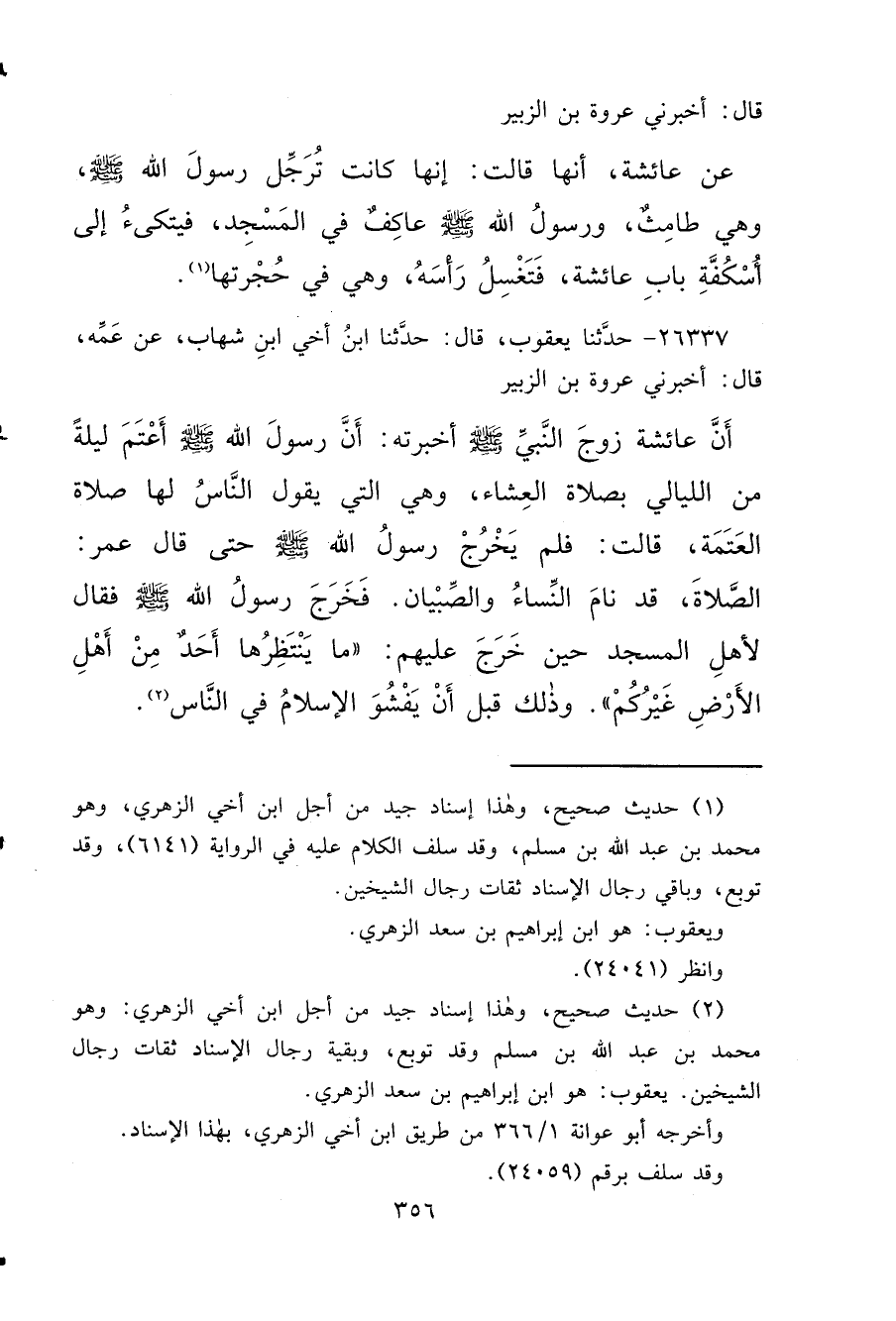 قَالَ: أَخْبَرَنِي عُرْوَةُ بْنُ الزُّبَيْرِ، عَنْ عَائِشَةَ، أَنَّهَا قَالَتْ: " إِنَّهَا كَانَتْ تُرَجِّلُ رَسُولَ اللهِ صَلَّى اللهُ عَلَيْهِ وَسَلَّمَ وَهِيَ طَامِثٌ، وَرَسُولُ اللهِ صَلَّى اللهُ عَلَيْهِ وَسَلَّمَ عَاكِفٌ فِي الْمَسْجِدِ، فَيَتَّكِئُ إِلَى أُسْكُفَّةِ بَابِ عَائِشَةَ، فَتَغْسِلُ رَأْسَهُ، وَهِيَ فِي حُجْرَتِهَا " (١)
