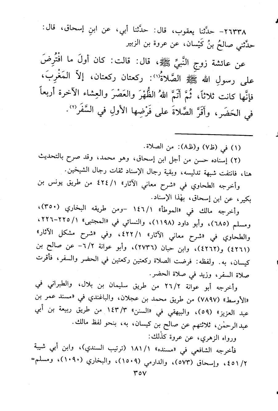 ٢٦٣٣٨ - حَدَّثَنَا يَعْقُوبُ، قَالَ: حَدَّثَنَا أَبِي، عَنِ ابْنِ إِسْحَاقَ، قَالَ: حَدَّثَنِي صَالِحُ بْنُ كَيْسَانَ، عَنْ عُرْوَةَ بْنِ الزُّبَيْرِ، عَنْ عَائِشَةَ، زَوْجِ النَّبِيِّ صَلَّى اللهُ عَلَيْهِ وَسَلَّمَ، قَالَ: قَالَتْ: " كَانَ أَوَّلَ مَا افْتُرِضَ عَلَى رَسُولِ اللهِ صَلَّى اللهُ عَلَيْهِ وَسَلَّمَ الصَّلَاةُ (١) : رَكْعَتَانِ رَكْعَتَانِ، إِلَّا الْمَغْرِبَ، فَإِنَّهَا كَانَتْ ثَلَاثًا، ثُمَّ أَتَمَّ اللهُ الظُّهْرَ وَالْعَصْرَ وَالْعِشَاءَ الْآخِرَةَ أَرْبَعًا فِي الْحَضَرِ، وَأَقَرَّ الصَّلَاةَ عَلَى فَرْضِهَا الْأَوَّلِ فِي السَّفَرِ " (٢)