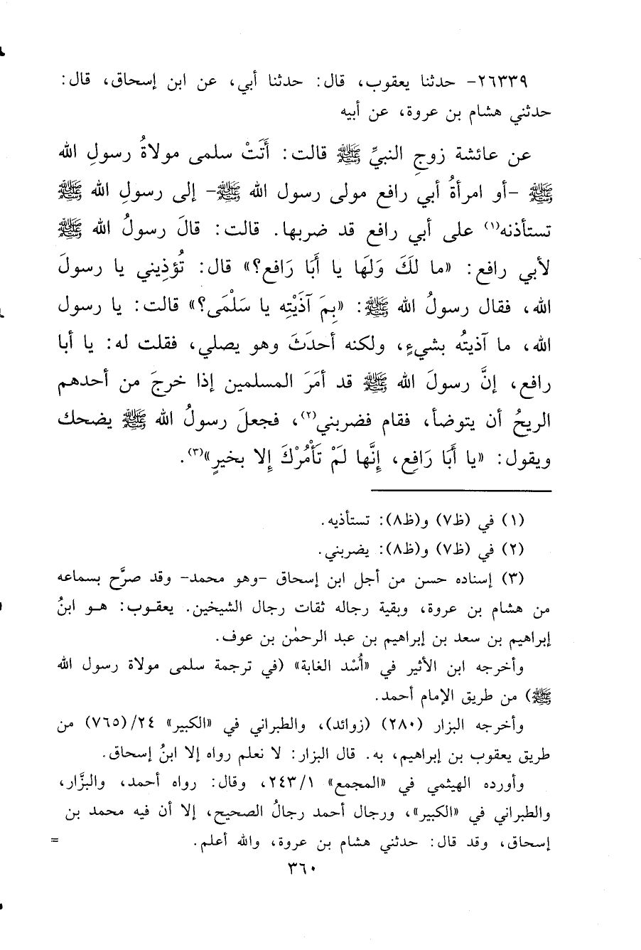 ٢٦٣٣٩ - حَدَّثَنَا يَعْقُوبُ، قَالَ: حَدَّثَنَا أَبِي، عَنِ ابْنِ إِسْحَاقَ، قَالَ: حَدَّثَنِي هِشَامُ بْنُ عُرْوَةَ، عَنْ أَبِيهِ، عَنْ عَائِشَةَ، زَوْجِ النَّبِيِّ صَلَّى اللهُ عَلَيْهِ وَسَلَّمَ قَالَتْ: أَتَتْ سَلْمَى مَوْلَاةُ رَسُولِ اللهِ صَلَّى اللهُ عَلَيْهِ وَسَلَّمَ أَوْ امْرَأَةُ أَبِي رَافِعٍ مَوْلَى رَسُولِ اللهِ صَلَّى اللهُ عَلَيْهِ وَسَلَّمَ إِلَى رَسُولِ اللهِ صَلَّى اللهُ عَلَيْهِ وَسَلَّمَ تَسْتَأْذِنُهُ (١) عَلَى أَبِي رَافِعٍ قَدْ ضَرَبَهَا. قَالَتْ: قَالَ رَسُولُ اللهِ صَلَّى اللهُ عَلَيْهِ وَسَلَّمَ لِأَبِي رَافِعٍ: " مَا لَكَ وَلَهَا يَا أَبَا رَافِعٍ؟ " قَالَ: تُؤْذِينِي يَا رَسُولَ اللهِ، فَقَالَ رَسُولُ اللهِ صَلَّى اللهُ عَلَيْهِ وَسَلَّمَ: " بِمَ آذَيْتِيهِ يَا سَلْمَى؟ " قَالَتْ: يَا رَسُولَ اللهِ، مَا آذَيْتُهُ بِشَيْءٍ، وَلَكِنَّهُ أَحْدَثَ وَهُوَ يُصَلِّي، فَقُلْتُ لَهُ: يَا أَبَا رَافِعٍ إِنَّ رَسُولَ اللهِ صَلَّى اللهُ عَلَيْهِ وَسَلَّمَ قَدْ أَمَرَ الْمُسْلِمِينَ إِذَا خَرَجَ مِنْ أَحَدِهِمُ الرِّيحُ أَنْ يَتَوَضَّأَ، فَقَامَ فَضَرَبَنِي (٢) ، فَجَعَلَ رَسُولُ اللهِ صَلَّى اللهُ عَلَيْهِ وَسَلَّمَ يَضْحَكُ وَيَقُولُ: " يَا أَبَا رَافِعٍ إِنَّهَا لَمْ تَأْمُرْكَ إِلَّا بِخَيْرٍ " (٣)