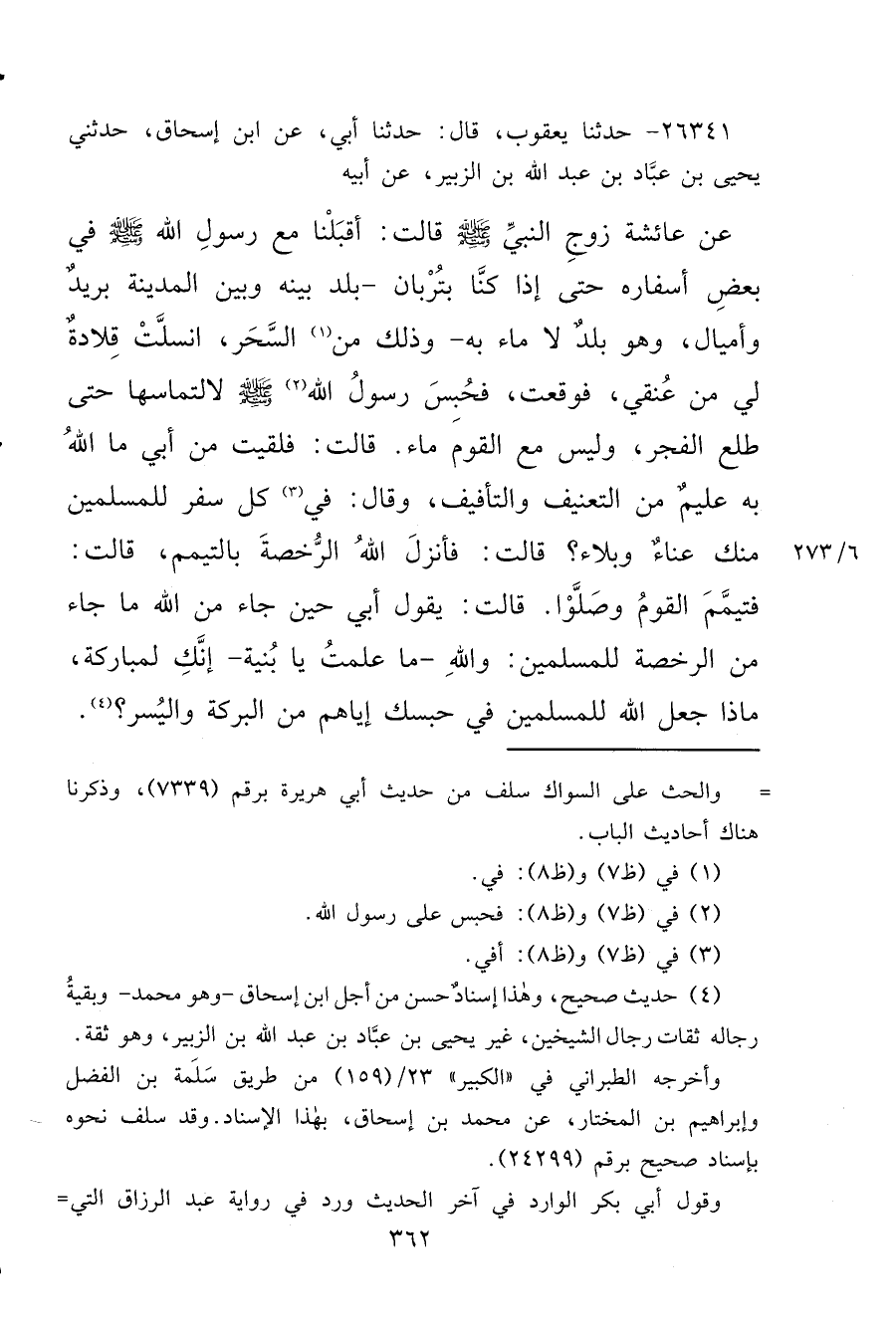 ٢٦٣٤١ - حَدَّثَنَا يَعْقُوبُ، قَالَ: حَدَّثَنَا أَبِي، عَنِ ابْنِ إِسْحَاقَ، حَدَّثَنِي يَحْيَى بْنُ عَبَّادِ بْنِ عَبْدِ اللهِ بْنِ الزُّبَيْرِ، عَنْ أَبِيهِ، عَنْ عَائِشَةَ، زَوْجِ النَّبِيِّ صَلَّى اللهُ عَلَيْهِ وَسَلَّمَ قَالَتْ: أَقْبَلْنَا مَعَ رَسُولِ اللهِ صَلَّى اللهُ عَلَيْهِ وَسَلَّمَ فِي بَعْضِ أَسْفَارِهِ حَتَّى إِذَا كُنَّا بِتُرْبَانَ، بَلَدٍ بَيْنَهُ وَبَيْنَ الْمَدِينَةِ بَرِيدٌ وَأَمْيَالٌ وَهُوَ بَلَدٌ لَا مَاءَ بِهِ، وَذَلِكَ مِنَ (١) السَّحَرِ، انْسَلَّتْ قِلَادَةٌ لِي مِنْ عُنُقِي، فَوَقَعَتْ، فَحُبِسَ رَسُولُ اللهِ (٢) صَلَّى اللهُ عَلَيْهِ وَسَلَّمَ لِالْتِمَاسِهَا حَتَّى طَلَعَ الْفَجْرُ، وَلَيْسَ مَعَ الْقَوْمِ مَاءٌ، قَالَتْ: فَلَقِيتُ مِنْ أَبِي مَا اللهُ بِهِ عَلِيمٌ مِنَ التَّعْنِيفِ وَالتَّأْفِيفِ، وَقَالَ: فِي (٣) كُلِّ سَفَرٍ لِلْمُسْلِمِينَ مِنْكِ عَنَاءٌ وَبَلَاءٌ؟ قَالَتْ: فَأَنْزَلَ اللهُ الرُّخْصَةَ بِالتَّيَمُّمِ، قَالَتْ: فَتَيَمَّمَ الْقَوْمُ وَصَلَّوْا. قَالَتْ: يَقُولُ أَبِي حِينَ جَاءَ مِنَ اللهِ مَا جَاءَ مِنَ الرُّخْصَةِ لِلْمُسْلِمِينَ: وَاللهِ، مَا عَلِمْتُ يَا بُنَيَّةُ، إِنَّكِ لَمُبَارَكَةٌ، مَاذَا جَعَلَ اللهُ لِلْمُسْلِمِينَ فِي حَبْسِكِ إِيَّاهُمْ مِنَ الْبَرَكَةِ وَالْيُسْرِ؟ (٤)