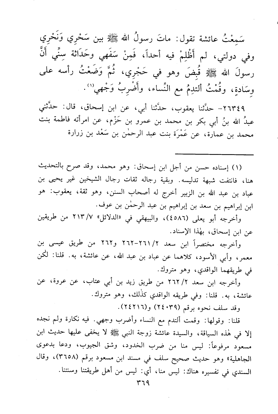 قلنا: وقولها: وقمت ألتدم مع النساء وأضرب وجهي. فيه نكارة ولم نجده إلا في هذه السياقة، والسيدة عائشة زوجة النبي صَلَّى اللهُ عَلَيْهِ وَسَلَّمَ لا يخفى عليها حديث ابن مسعود مرفوعاً: ليس منا من ضرب الخدود، وشق الجيوب، ودعا بدعوى الجاهلية" وهو حديث صحيح سلف في مسند ابن مسعود برقم (٣٦٥٨) ، وقال السندي في تفسيره هناك: ليس منا، أي: ليس من أهل طريقتنا وسنتنا.