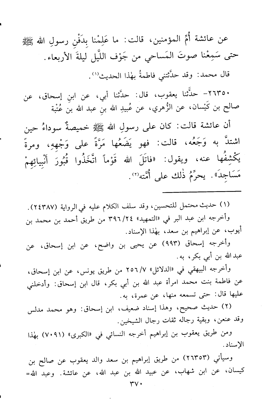 ٢٦٣٥٠ - حَدَّثَنَا يَعْقُوبُ، قَالَ: حَدَّثَنَا أَبِي، عَنِ ابْنِ إِسْحَاقَ، عَنِ صَالِحِ بْنِ كَيْسَانَ، عَنِ الزُّهْرِيِّ، عَنْ عُبَيْدِ اللهِ بْنِ عَبْدِ اللهِ بْنِ عُتْبَةَ، أَنَّ عَائِشَةَ، قَالَتْ: كَانَ عَلَى رَسُولِ اللهِ صَلَّى اللهُ عَلَيْهِ وَسَلَّمَ خَمِيصَةٌ سَوْدَاءُ حِينَ اشْتَدَّ بِهِ وَجَعُهُ، قَالَتْ: فَهُوَ يَضَعُهَا مَرَّةً عَلَى وَجْهِهِ، وَمَرَّةً يَكْشِفُهَا عَنْهُ، وَيَقُولُ: " قَاتَلَ اللهُ قَوْمًا اتَّخَذُوا قُبُورَ أَنْبِيَائِهِمْ مَسَاجِدَ " يُحَرِّمُ ذَلِكَ عَلَى أُمَّتِهِ (٢)